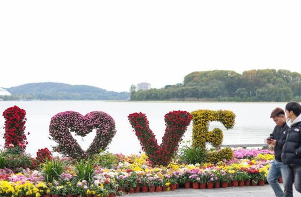 11月17日,江苏南京,市民从菊花组成的“LOVE”前经过。