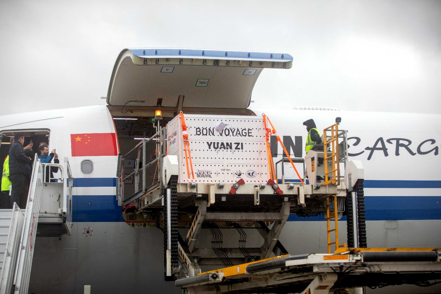旅法中国大熊猫“欢欢”和“圆仔”在巴黎戴高乐机场启程回中国。