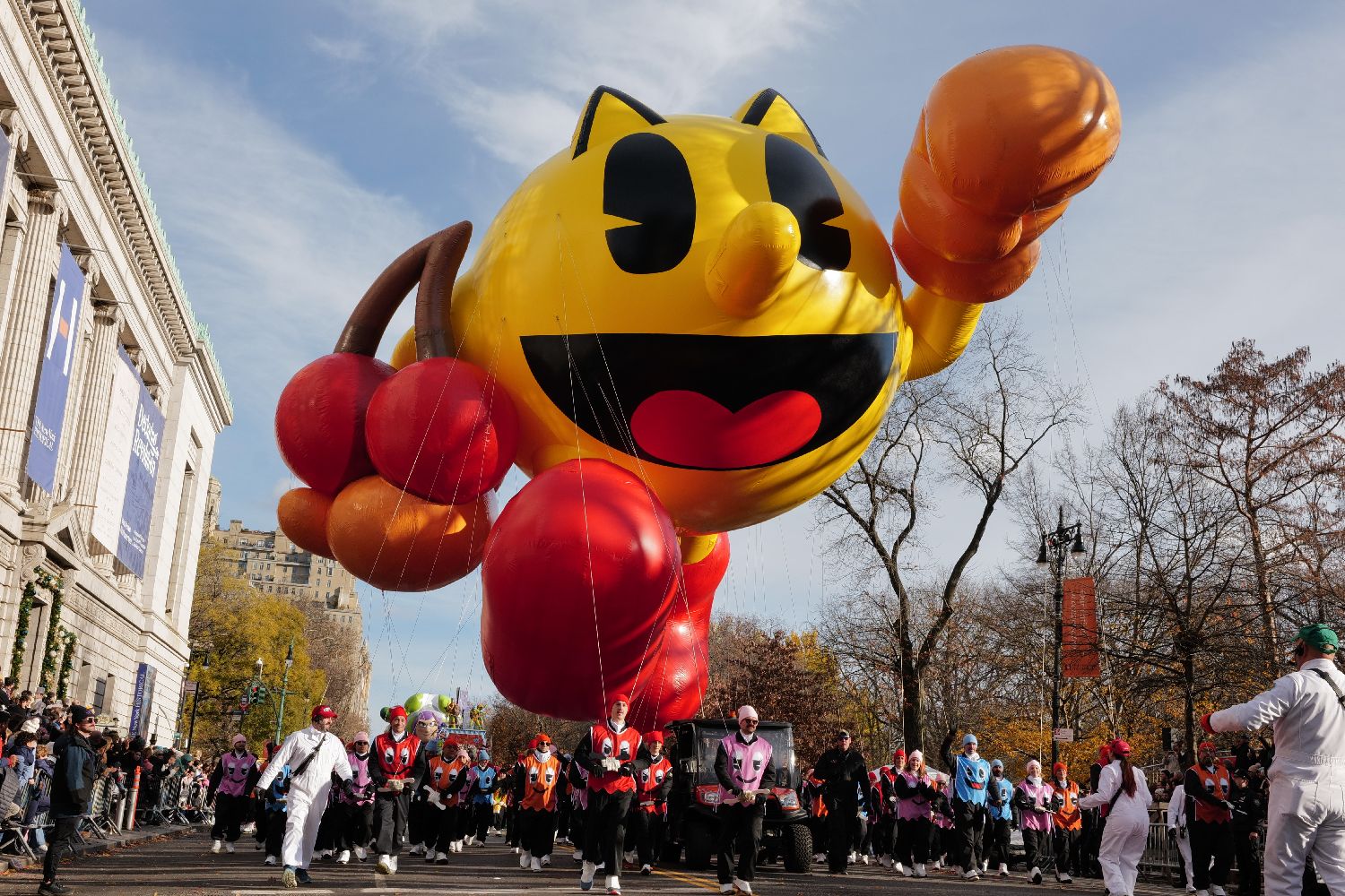 图为“吃豆人”巨型气球首次亮相纽约感恩节大游行。