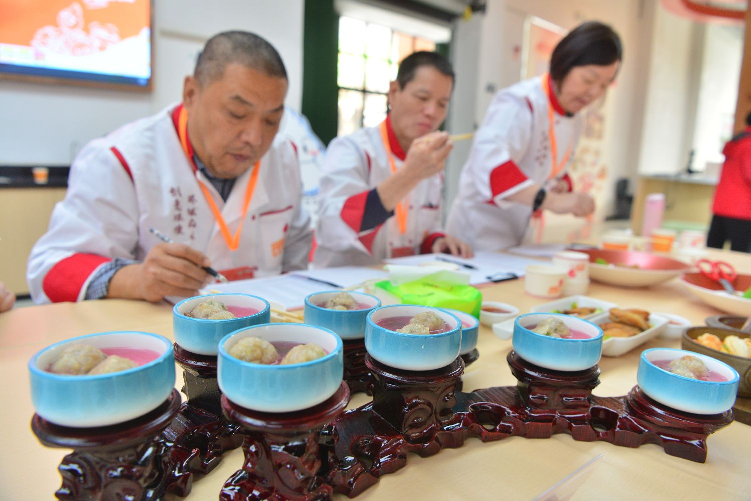 评委品尝菜品并打分。