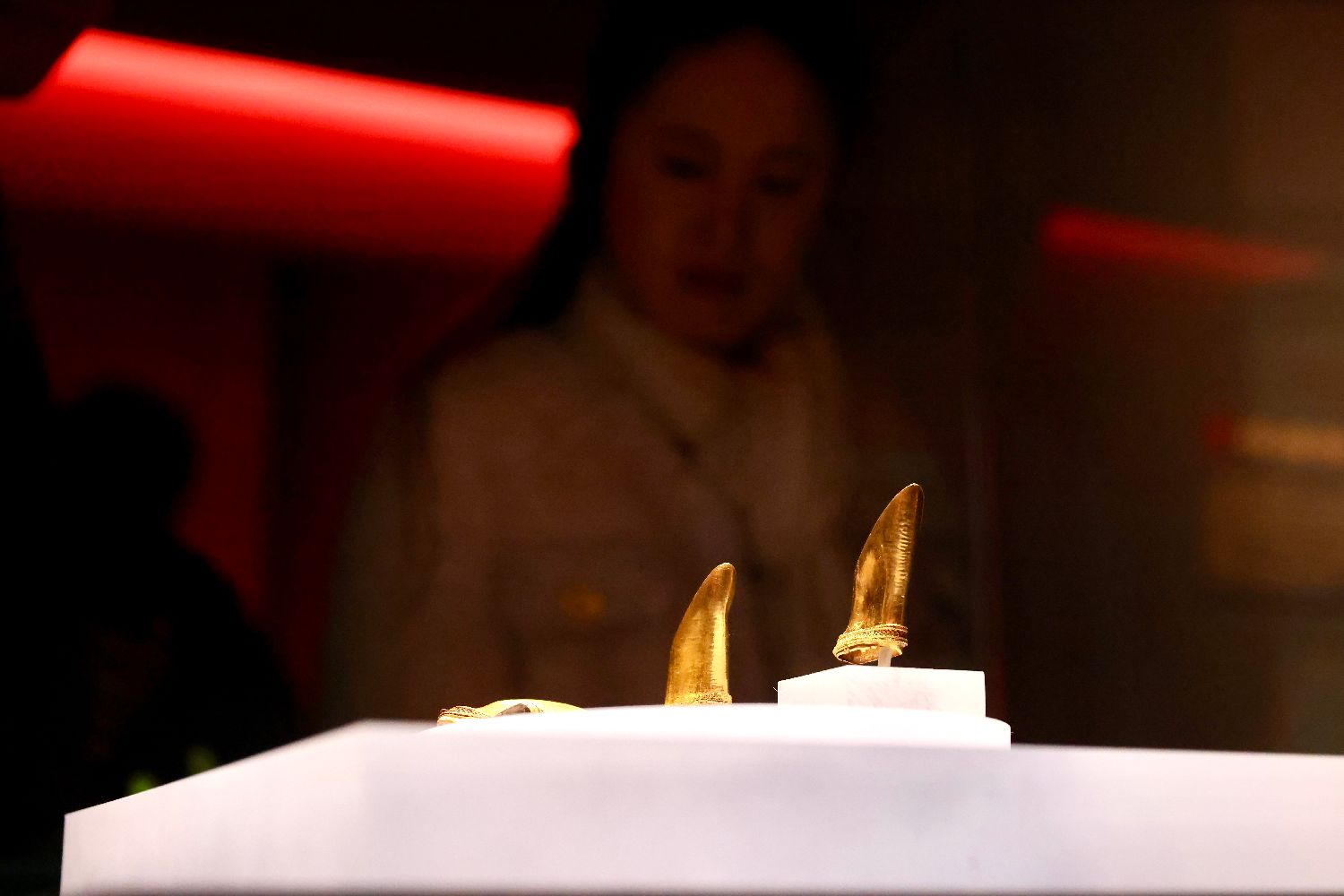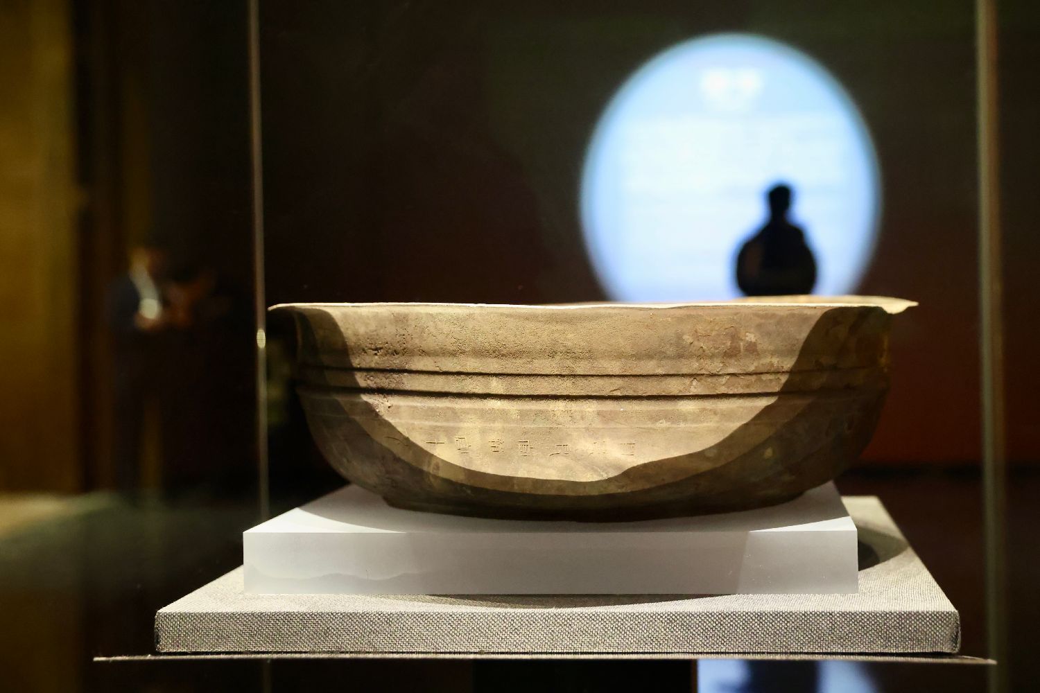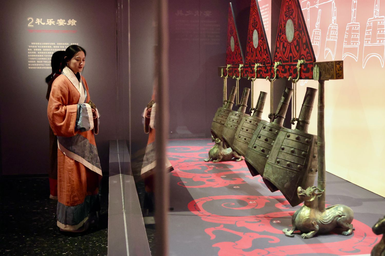 穿着汉代服饰的工作人员参观几何纹青铜甬钟。