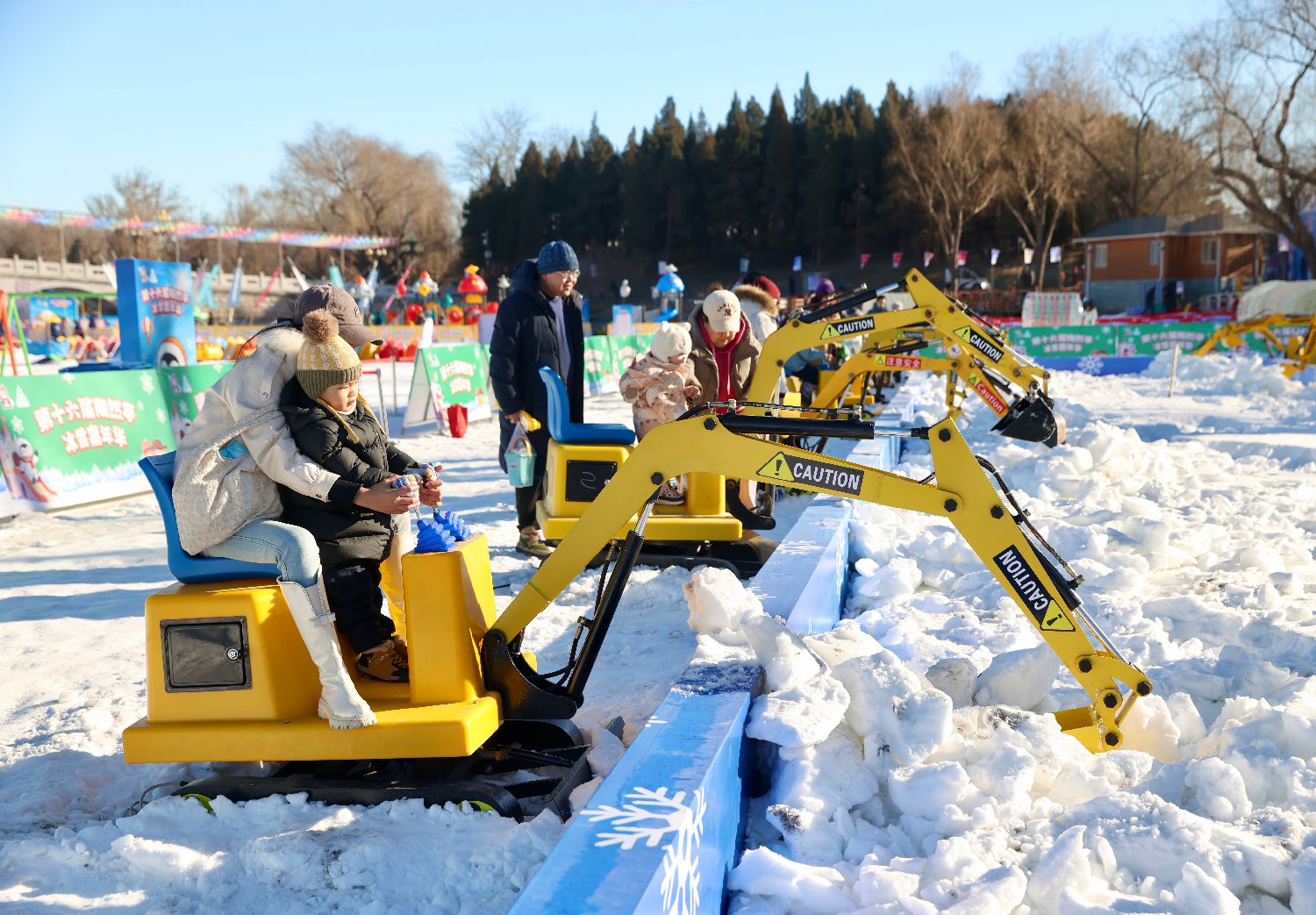 25日,家长带着孩子在北京陶然亭公园体验雪地挖掘机项目。