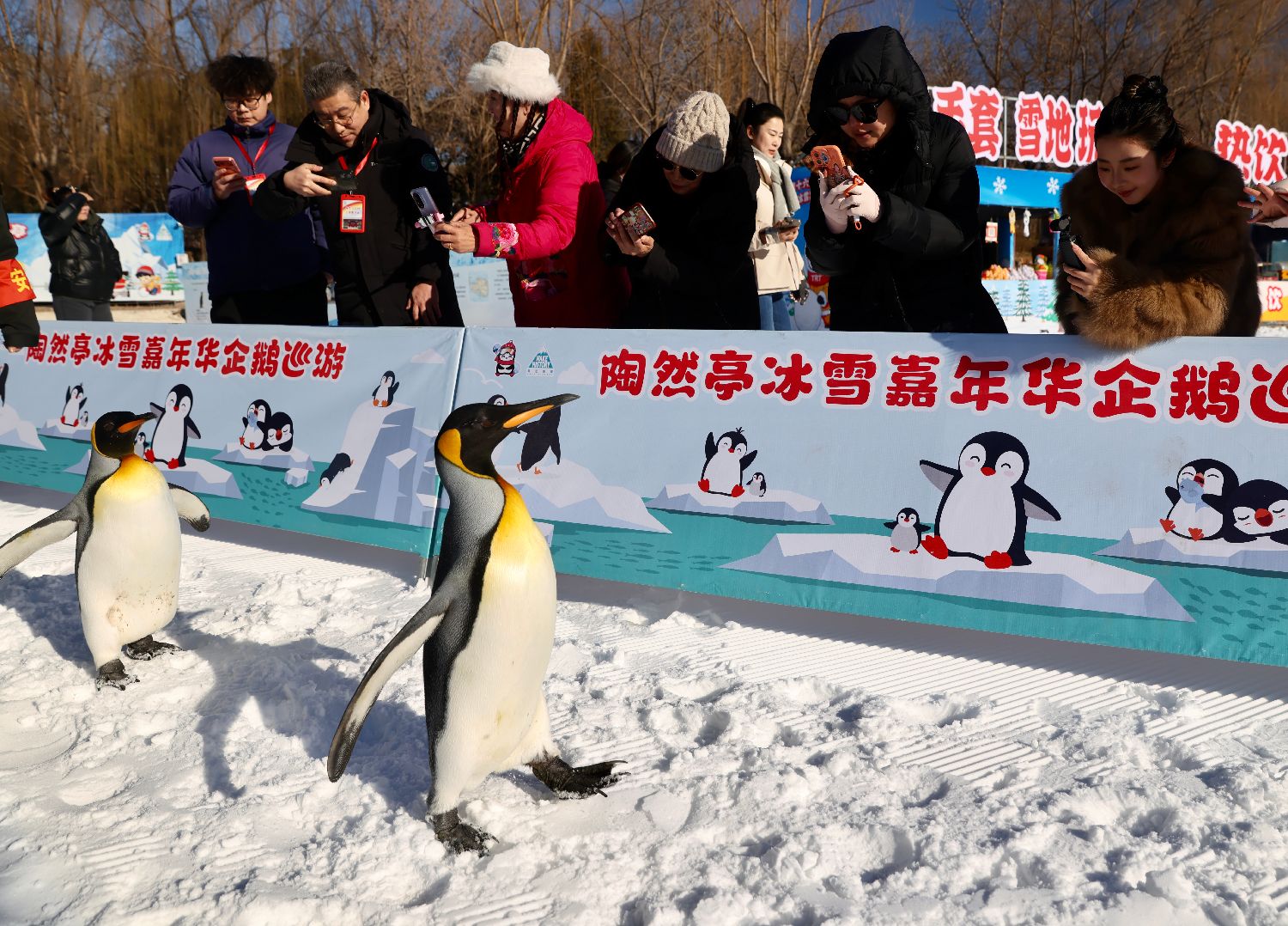 民众在北京陶然亭公园参观企鹅巡游活动。