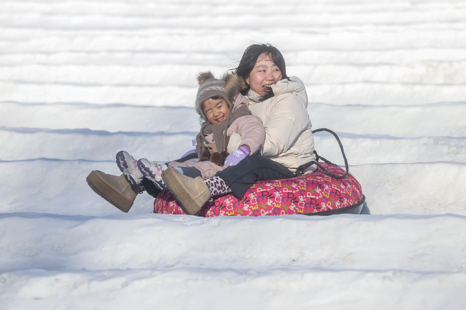 25日,家长带着孩子在北京陶然亭公园体验“雪上飞碟”项目。
