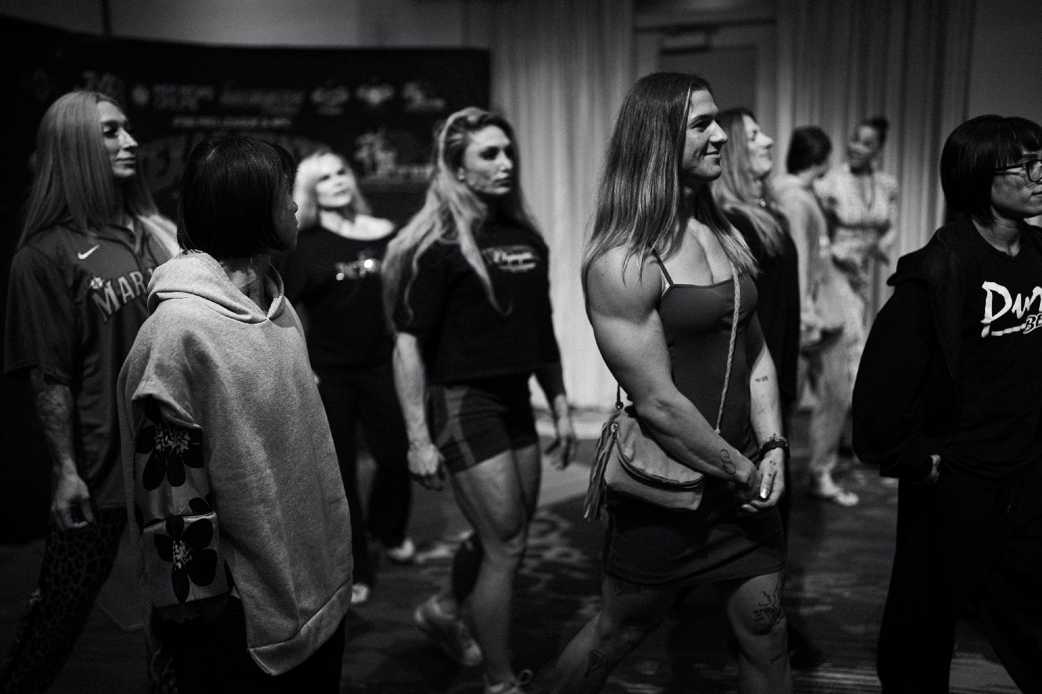 11月7日,得克萨斯州圣马科斯,康春米在“得克萨斯健美职业赛”检录后,与将要同场竞技的选手走在一起。康春米表示,作为亚洲女性,她的骨架和肌肉生长潜力与本土选手存在先天差异。