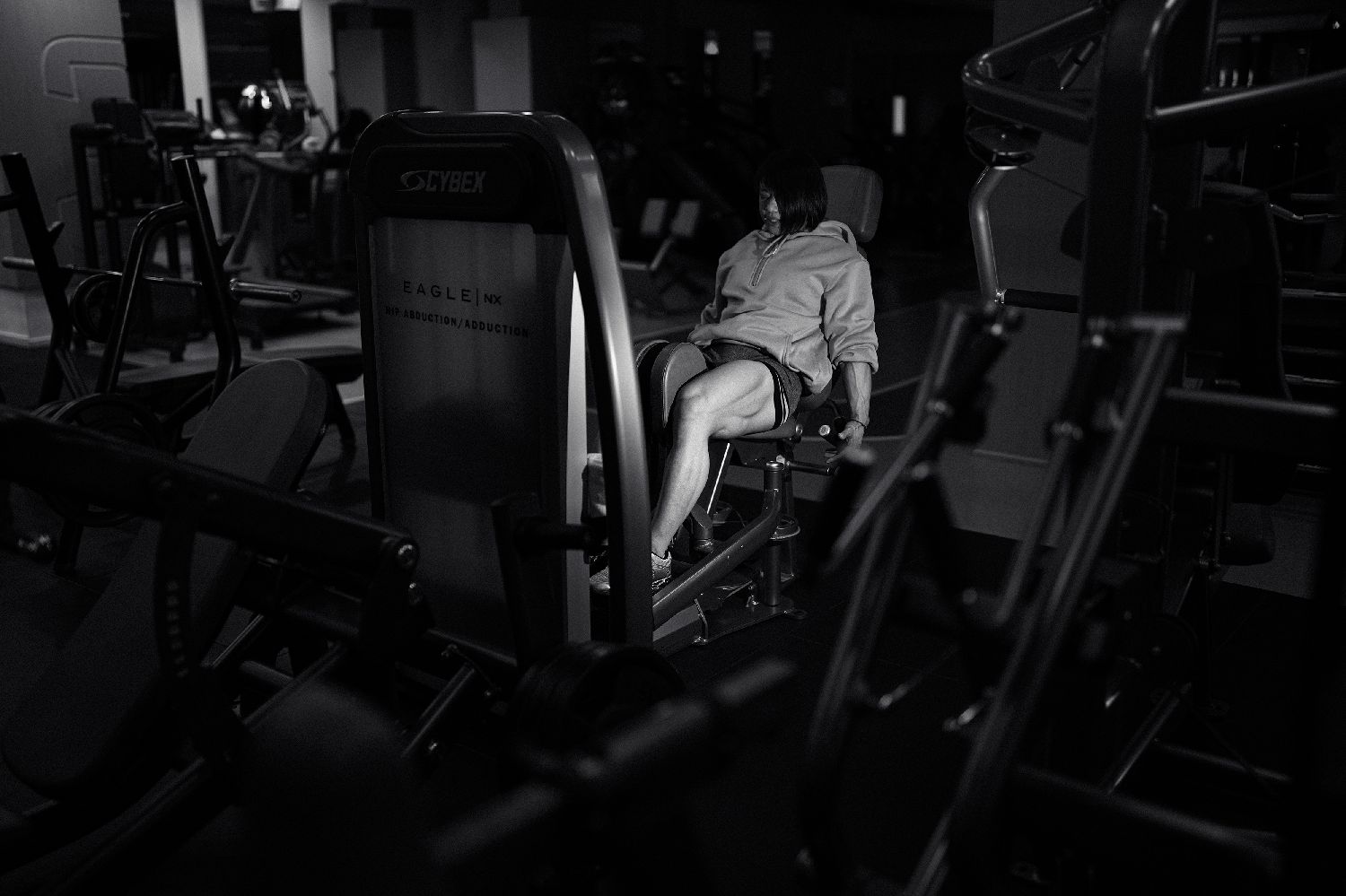 10月30日凌晨,纽约,康春米在进行腿部训练。为了不影响其他会员训练,她常常天不亮就到其供职的健身房进行训练,而她的老板亚洲健美锦标赛女子冠军曹新丽也常常资助她参加比赛。