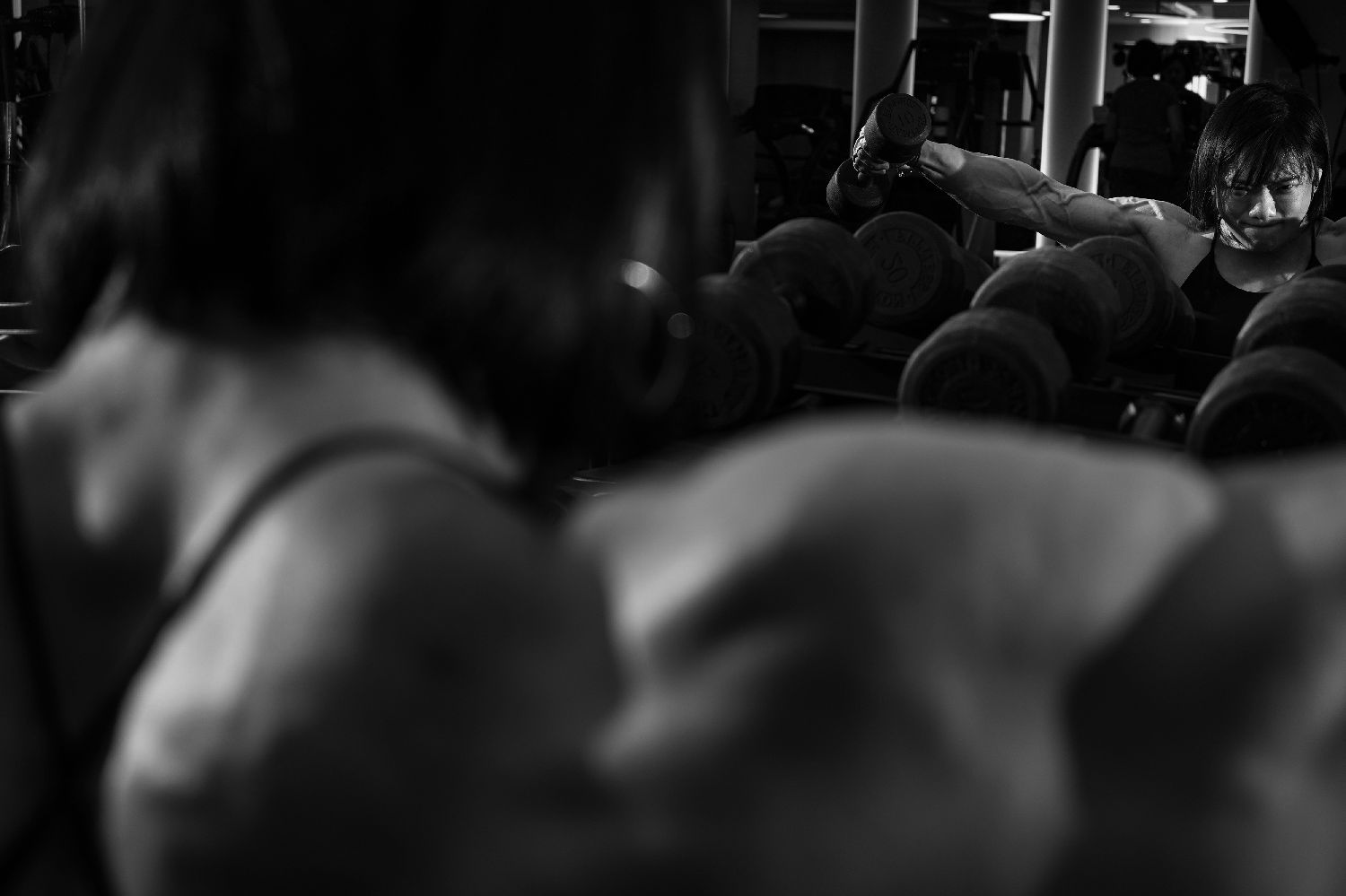 目前,奥赛女子形体项目还是中国运动员的空白地带,实现这一突破正是康春米追逐的梦想。两年来,康春米既是职业选手又是私人教练,既有一场场赛事的艰难打拼,也有教与学间的欢声笑语,身份重叠拉长了康春米的星夜与白昼,却从未磨灭“雕刻”自我的执念。图为9月29日,纽约,康春米在教练工作的空余时间用哑铃进行肩部训练。