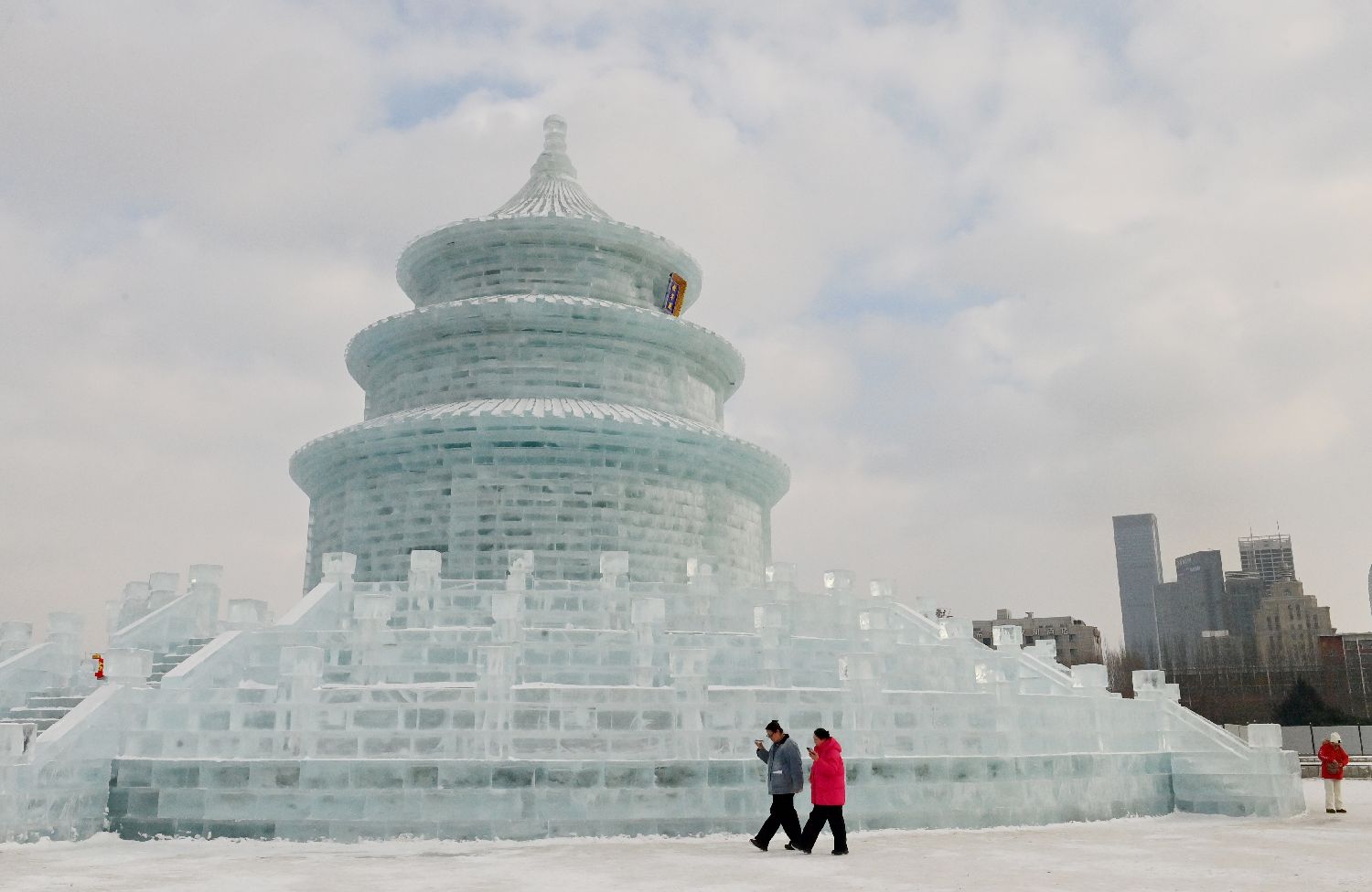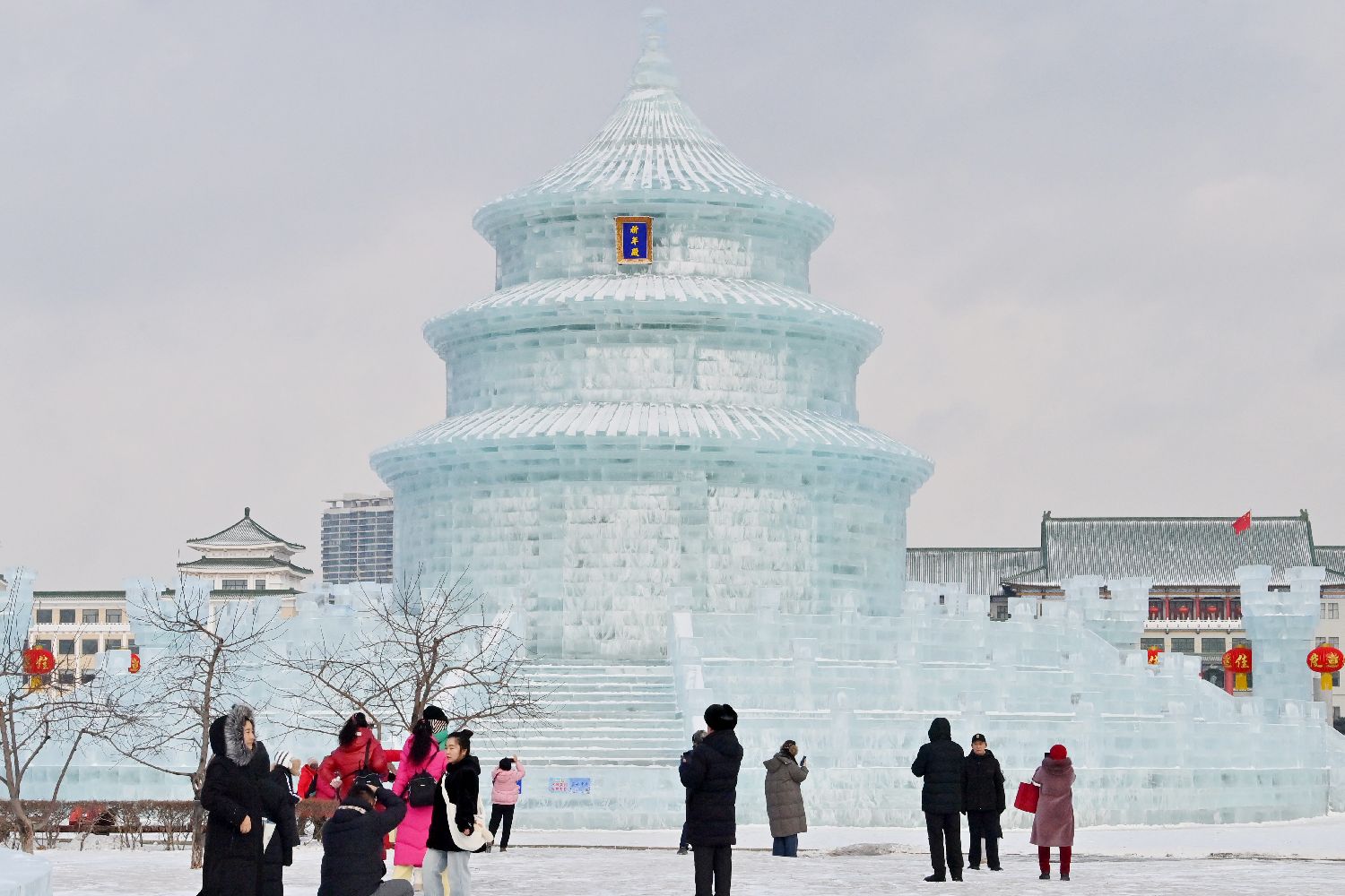 长春市文化广场的“祈年殿”巨型冰雕吸引游客。