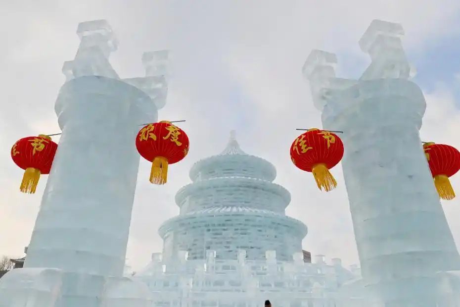 12日,在长春市的文化广场上,一座以北京天坛祈年殿为原型的巨型冰雕成为冬日一景。冰雕高约21米,用冰量5010立方米,飞檐、殿顶等传统建筑细节均被精准复刻,阳光下晶莹剔透,配合红灯笼冰柱点缀,尽显中式浪漫韵味,吸引众多游客前来拍照打卡。