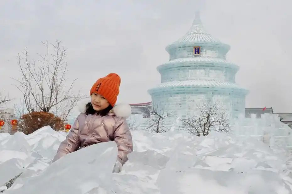小女孩在长春市文化广场的“祈年殿”巨型冰雕前拍照。