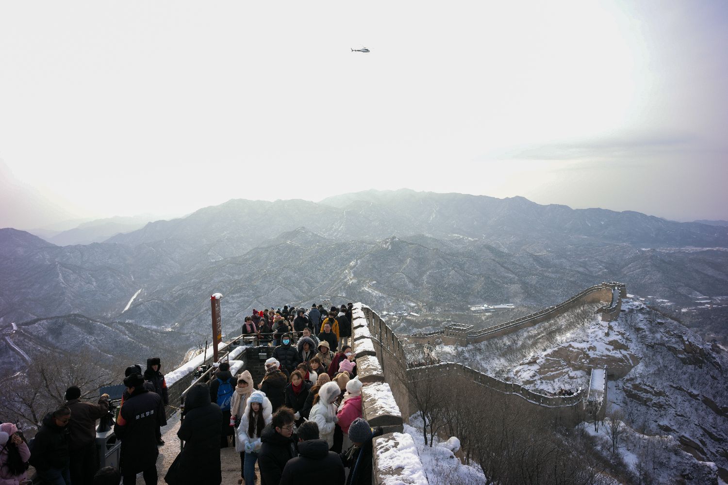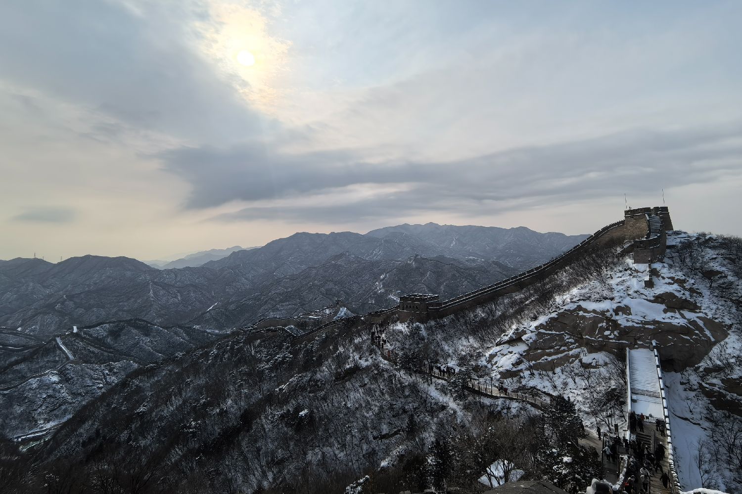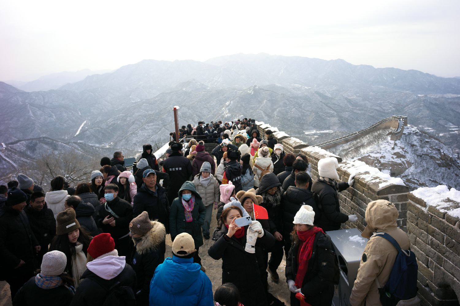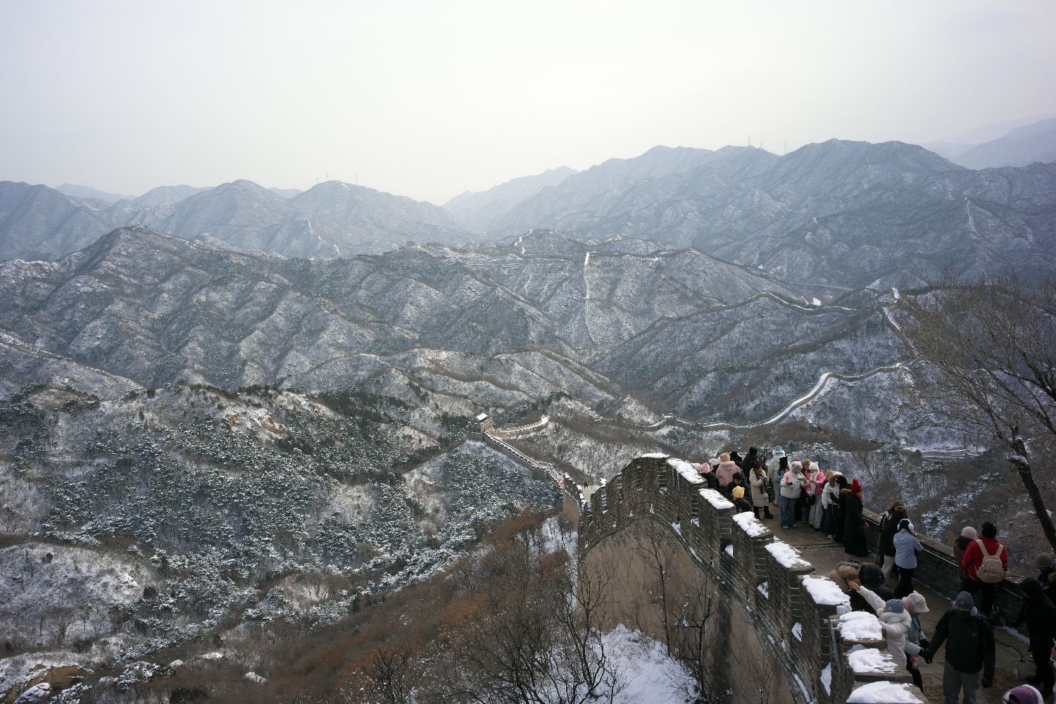 北京迎来新年初雪。白雪皑皑中,蜿蜒的城墙与烽火台银装素裹,吸引不少游客冒雪登八达岭长城游览、赏雪景。