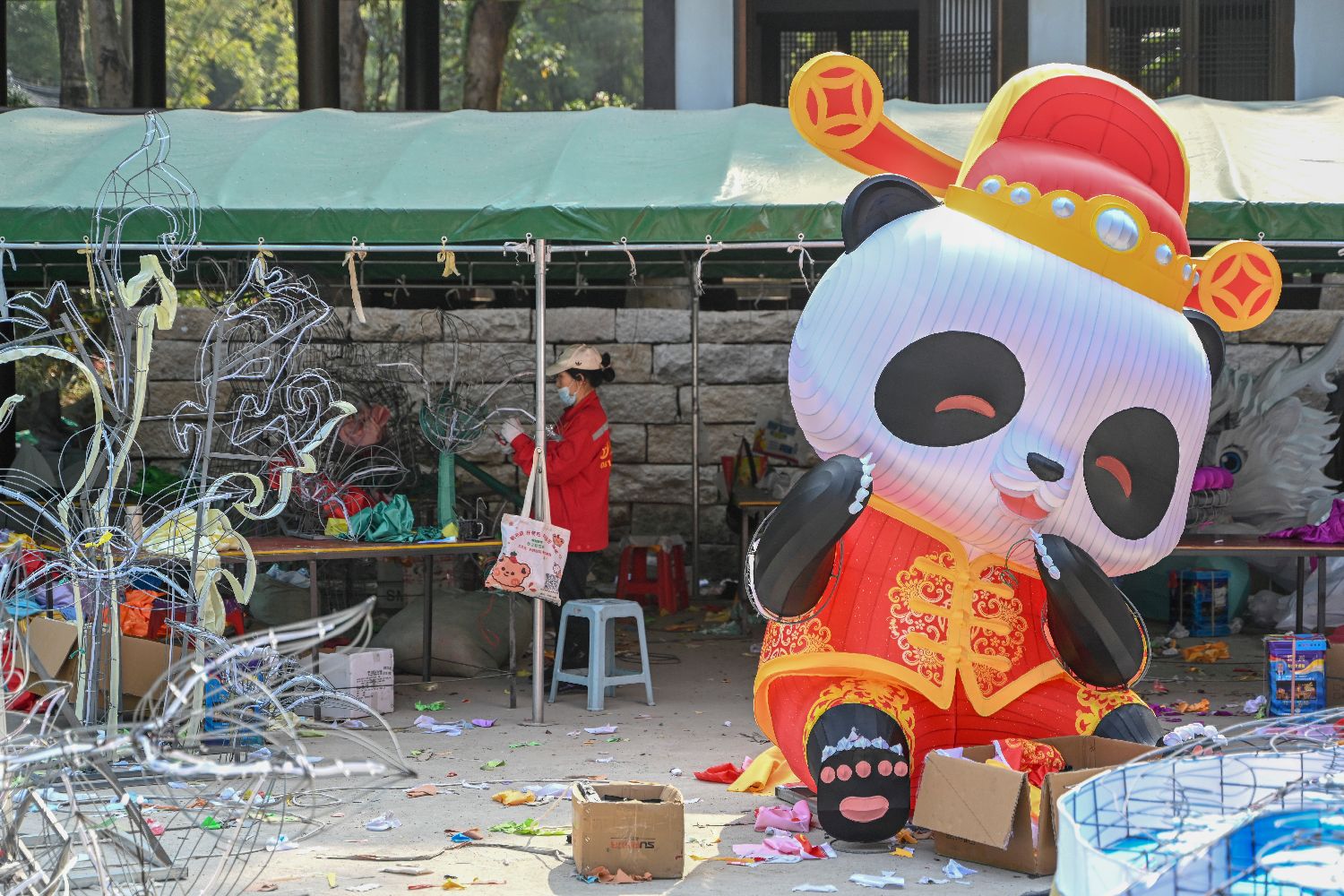 工作人员19日在广州越秀公园内制作花灯骨架。