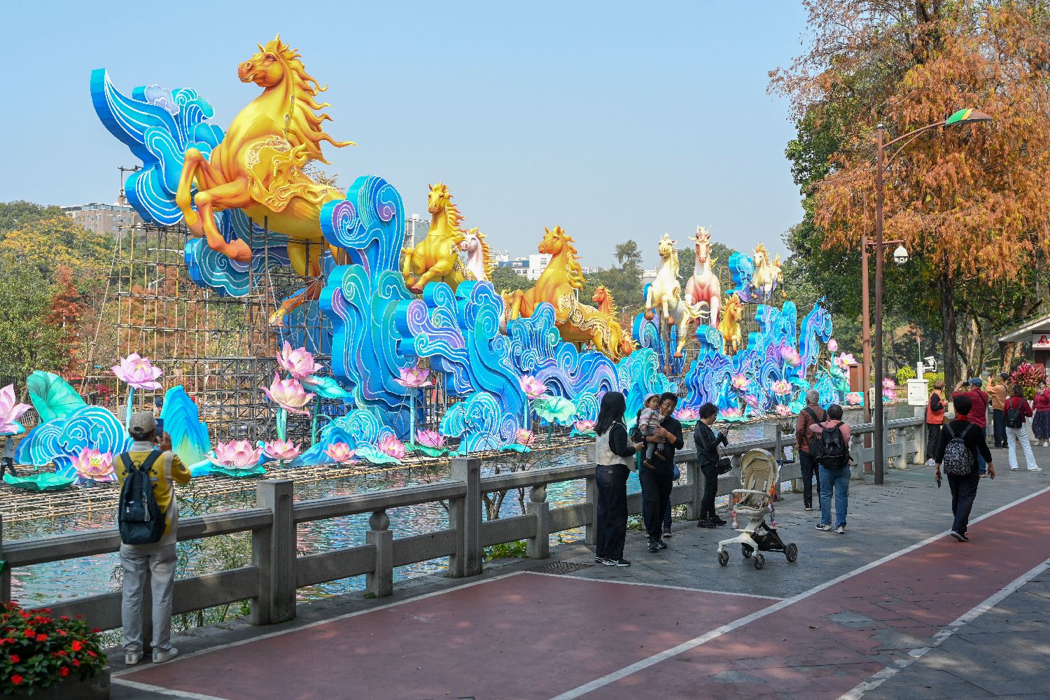 广州越秀公园内的“马年”主题灯组正在搭建。