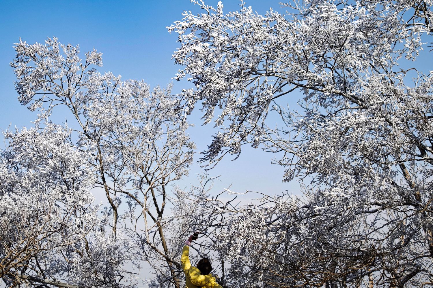 民众拍摄雪后的南京紫金山头陀岭出现雾凇奇观。