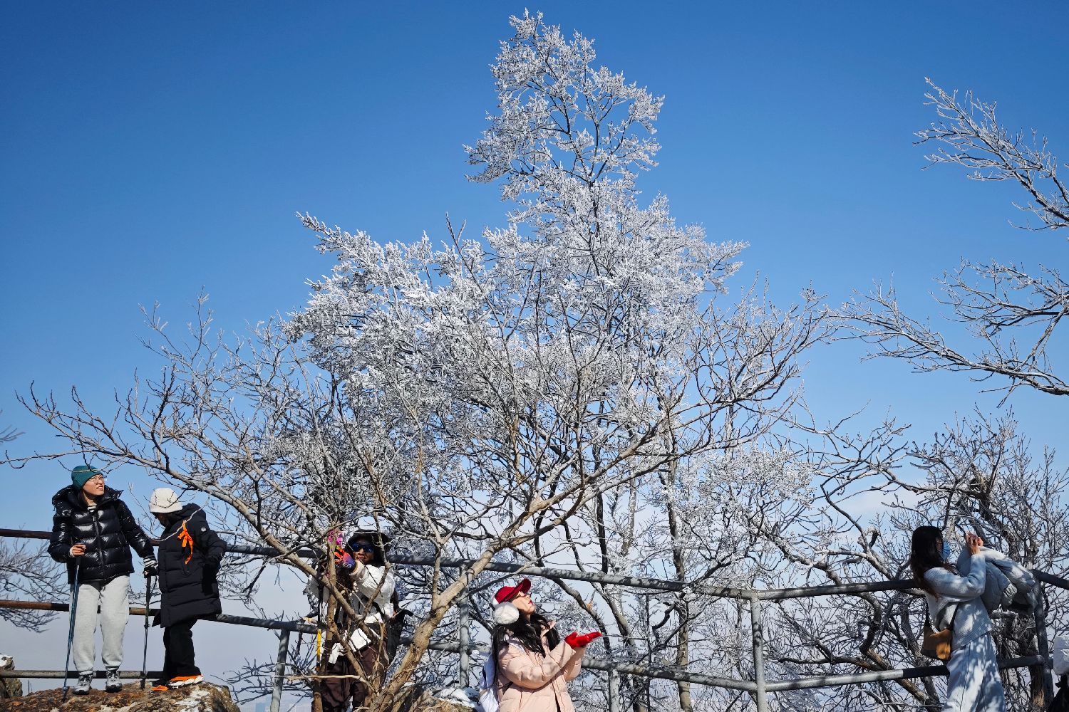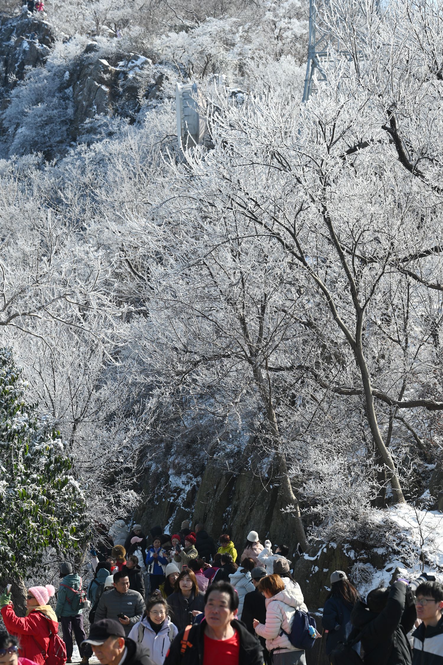 雪后的南京紫金山头陀岭出现雾凇奇观吸引民众参观拍照。