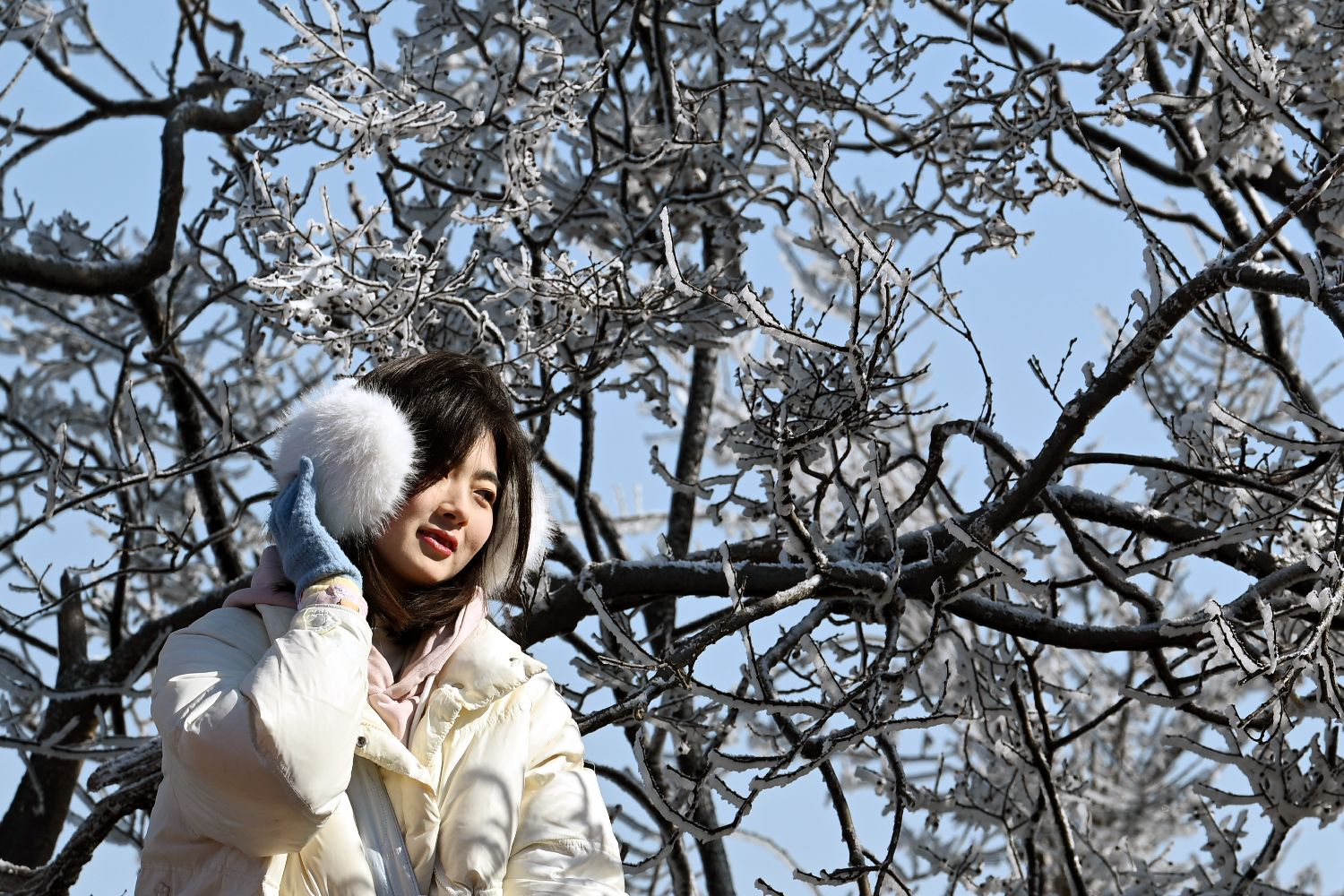 一名女子与雾凇奇观合影。