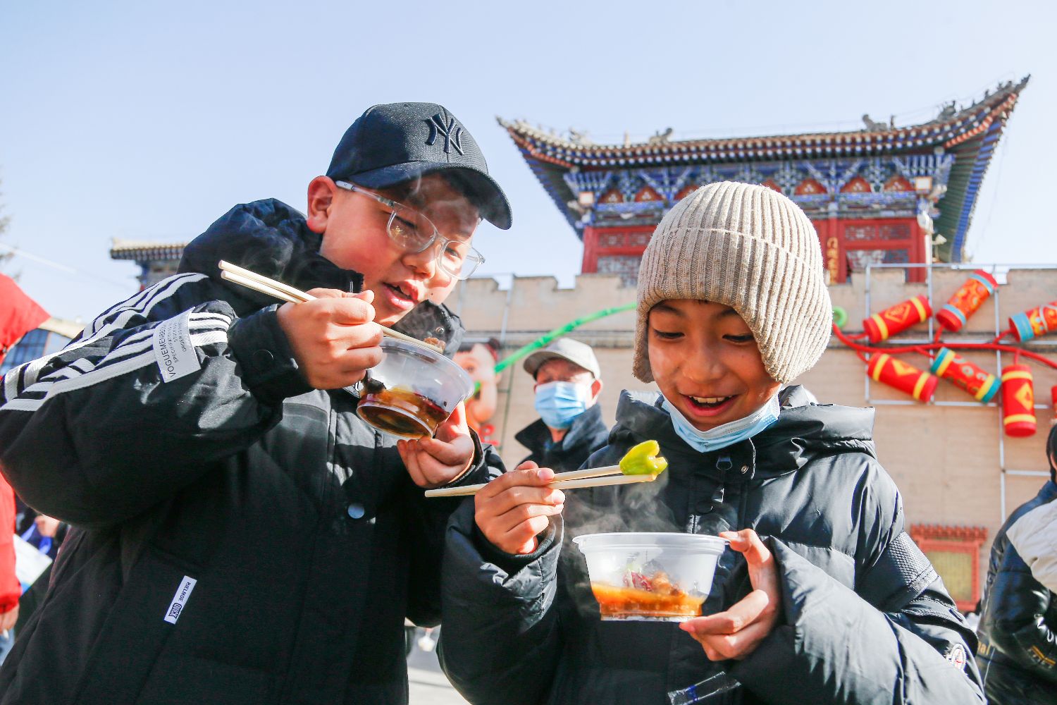 青海省西宁市湟源县26日举行第十三届丹噶尔古城“万人品腊八”活动。图为小朋友品尝琪玛会美食。