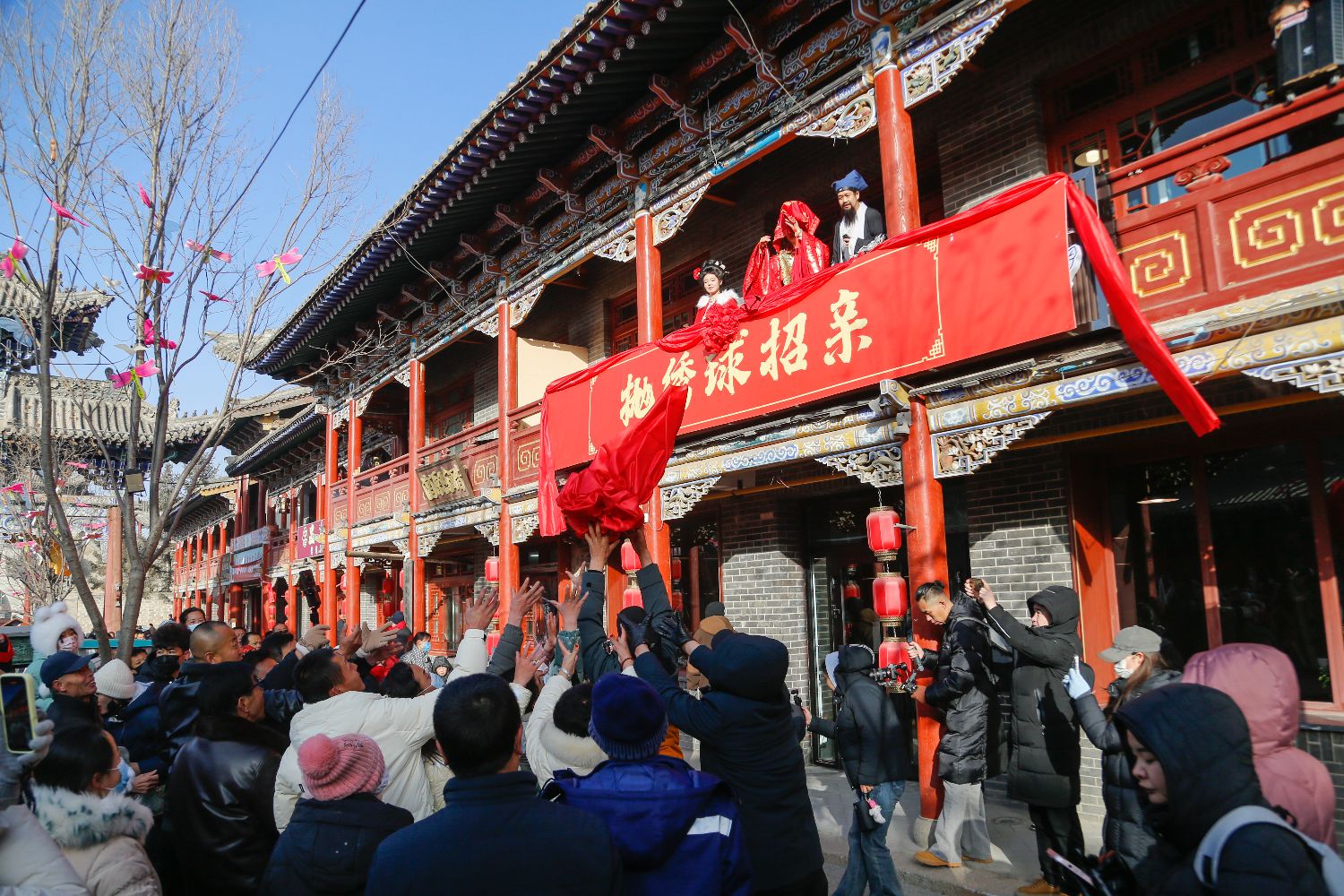 青海省西宁市湟源县举行第十三届丹噶尔古城“万人品腊八”活动。图为民众体验抢绣球。