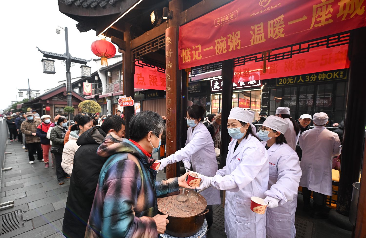 图为在浙江杭州,百年老字号方回春堂派发健康养生腊八粥,吸引不少市民领取和品尝。