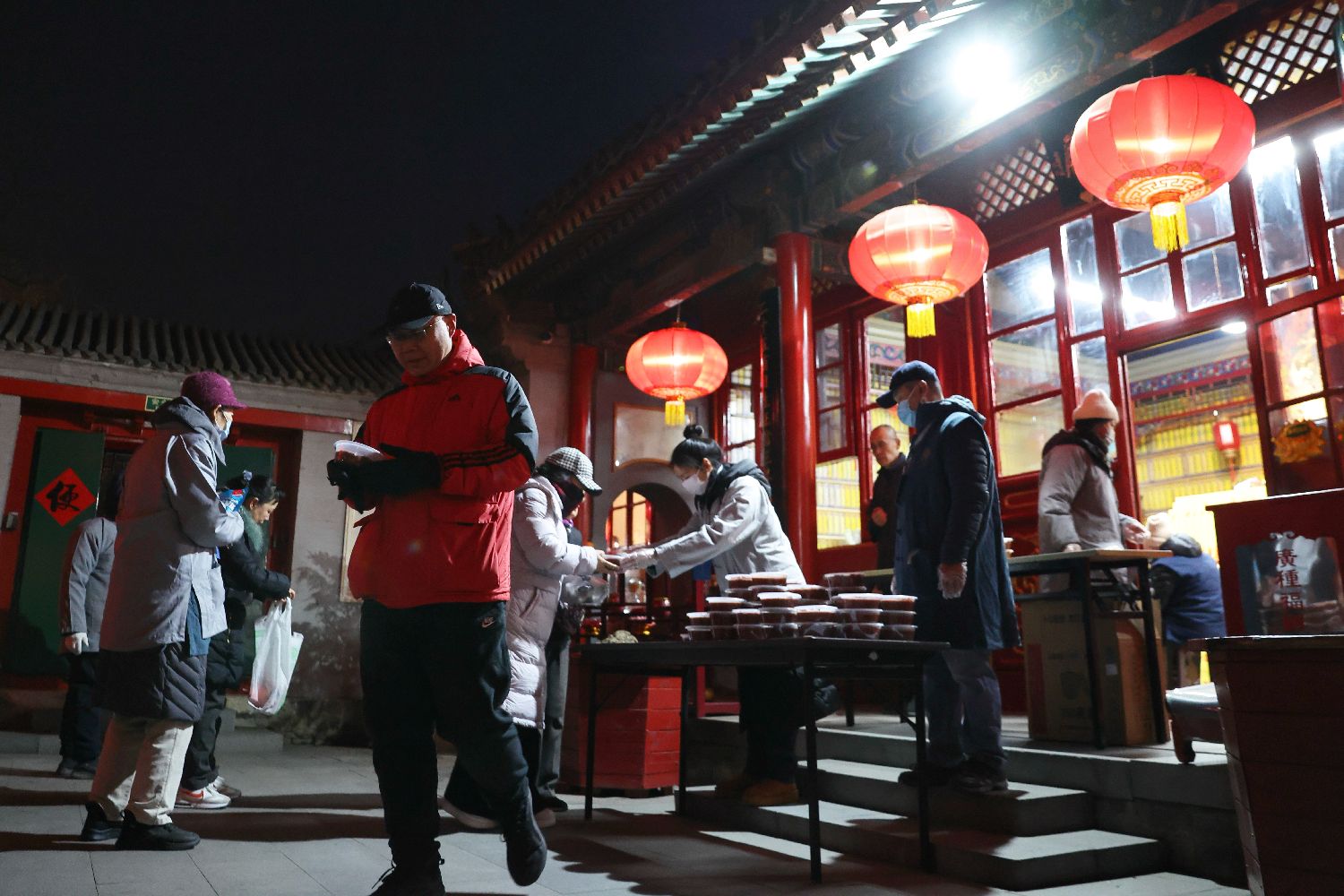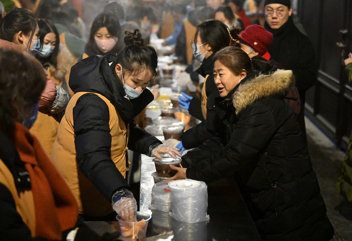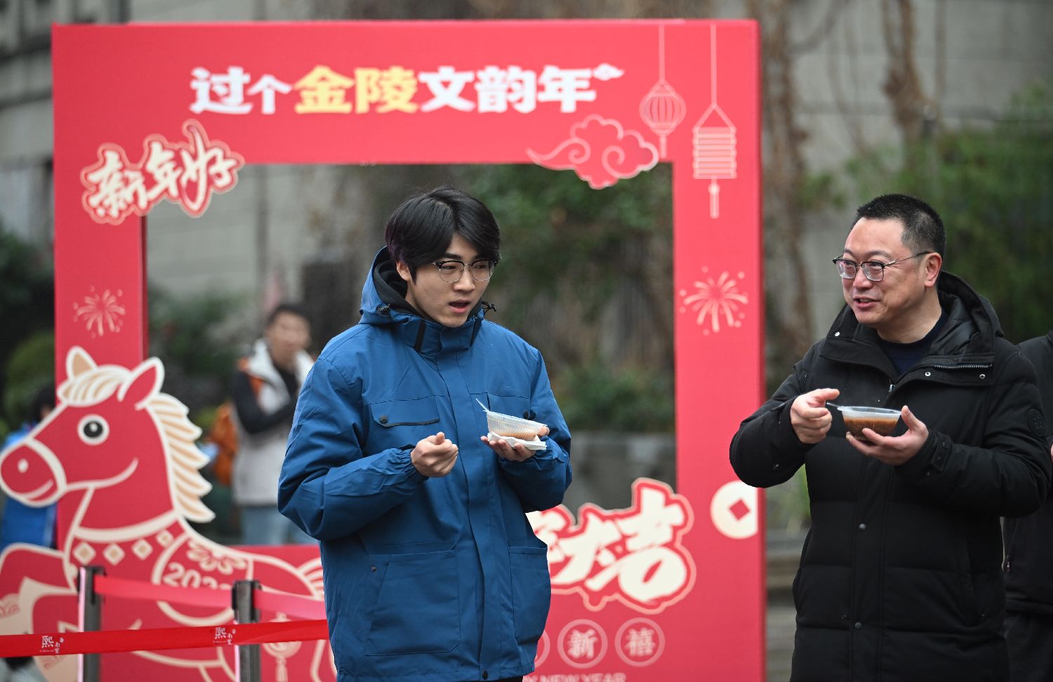 民众26日在江苏南京街头品尝免费派送的腊八粥。
