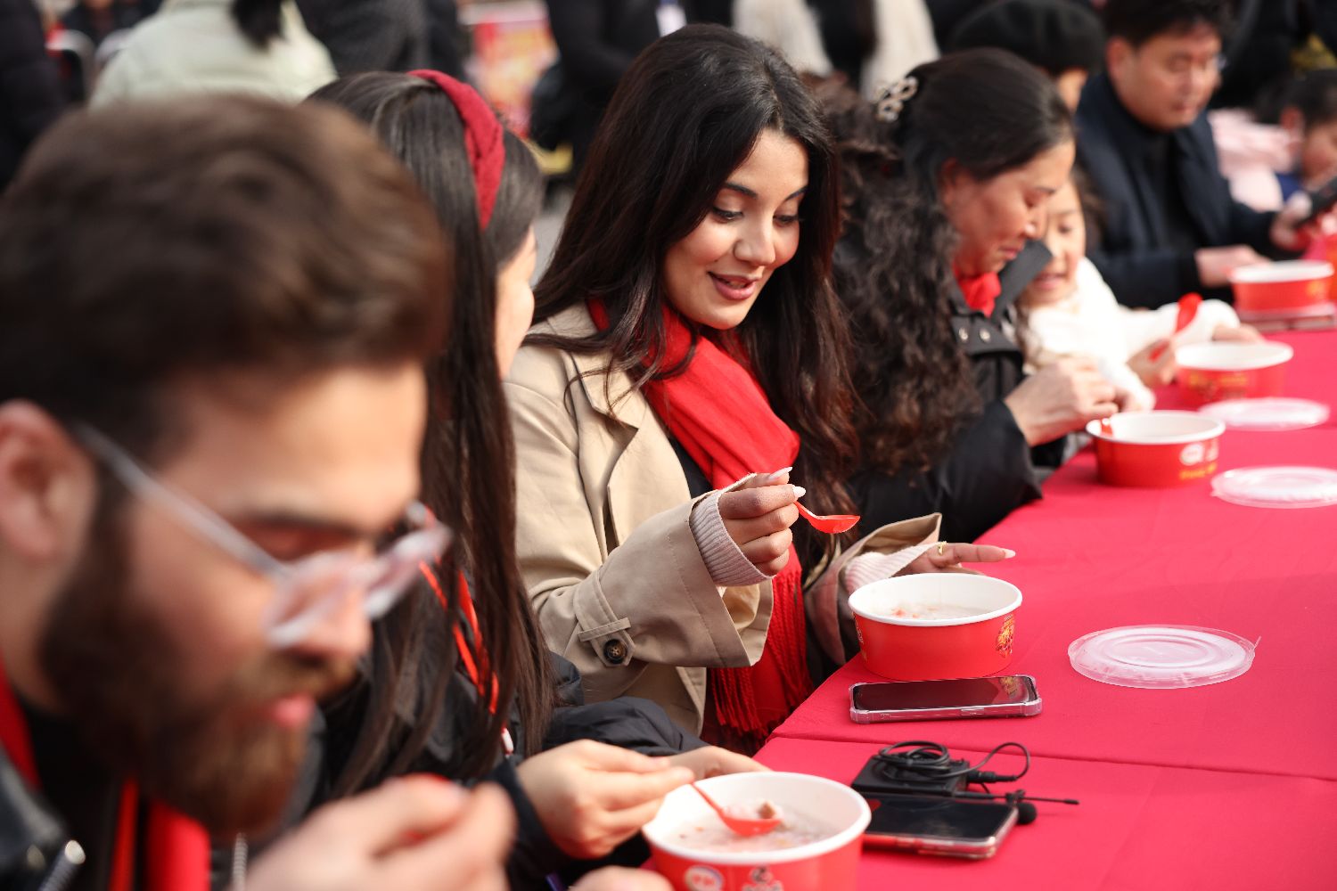 四川阆中古城举行“我在阆中过腊八”主题活动,邀请各地游客品尝腊八粥。图为外籍留学生品尝腊八粥。