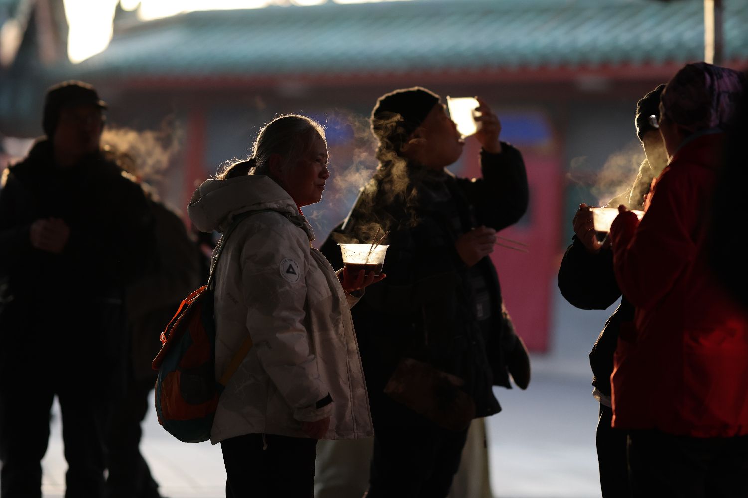 1月26日是中国传统的腊八节。图为民众在安徽合肥开福寺领取腊八粥。