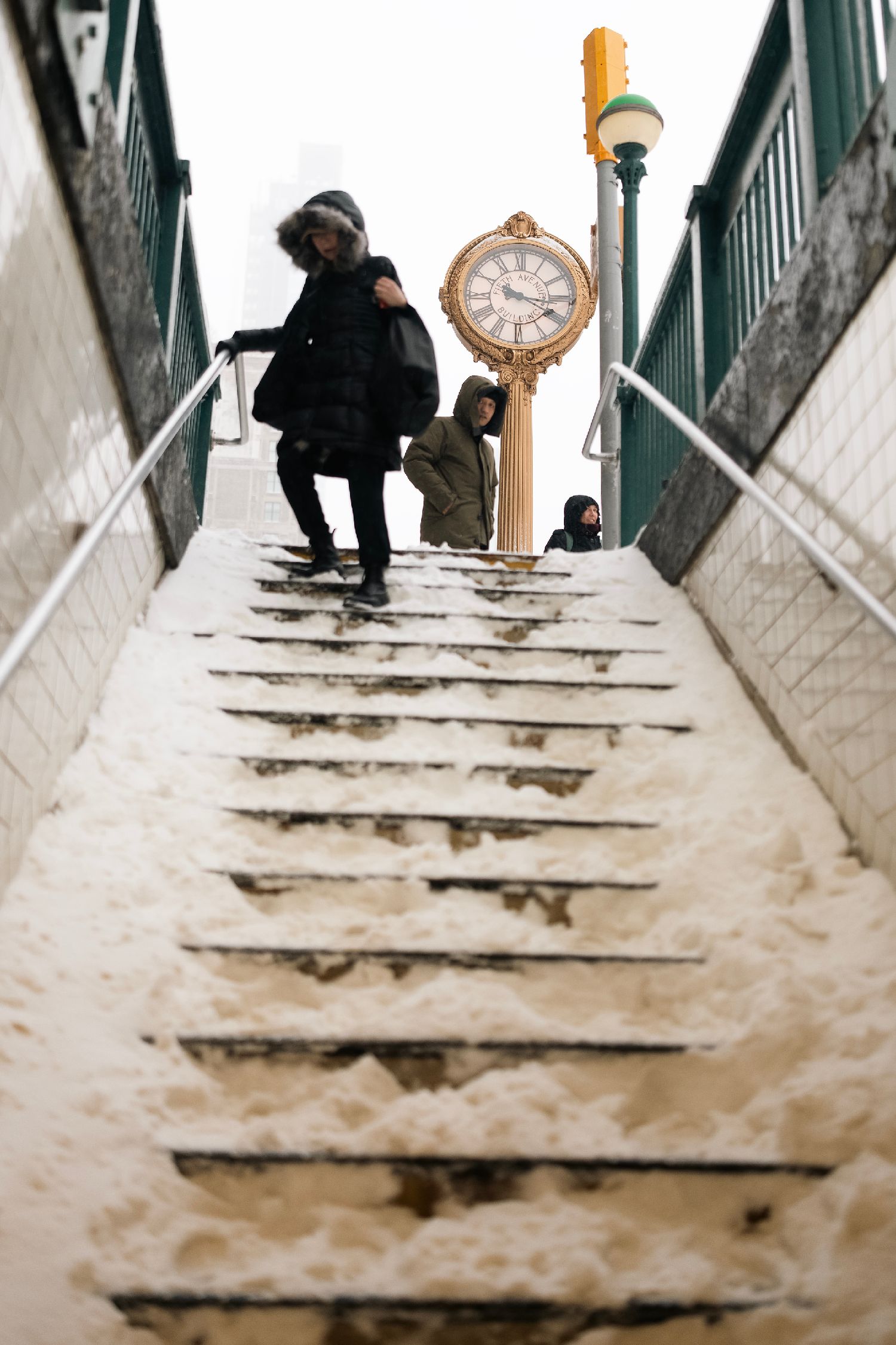 曼哈顿一个地铁站的阶梯积雪成坡,为人们出行带来困难。