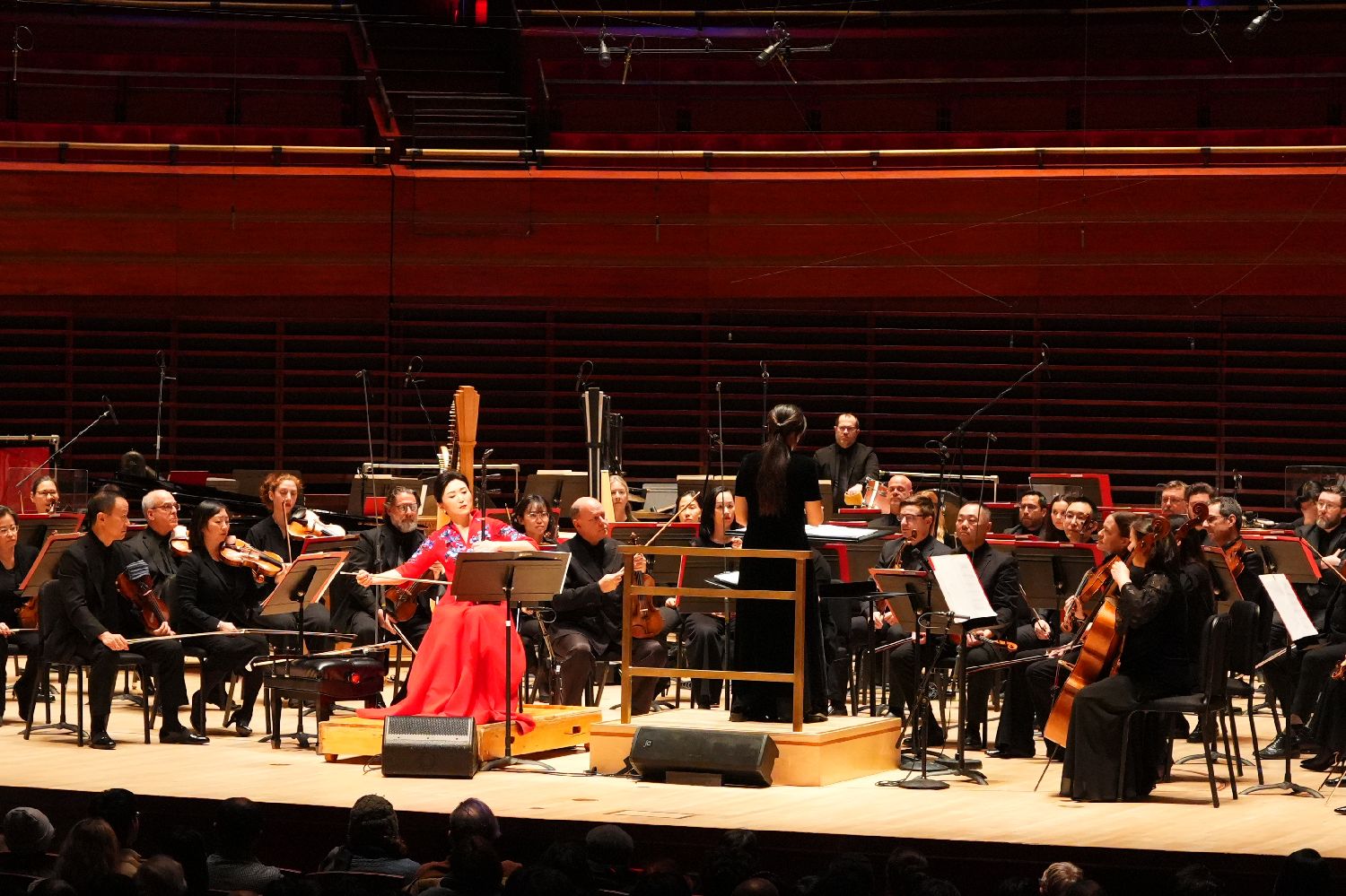 图为中国著名民乐演奏家于红梅与费城交响乐团合奏表演。