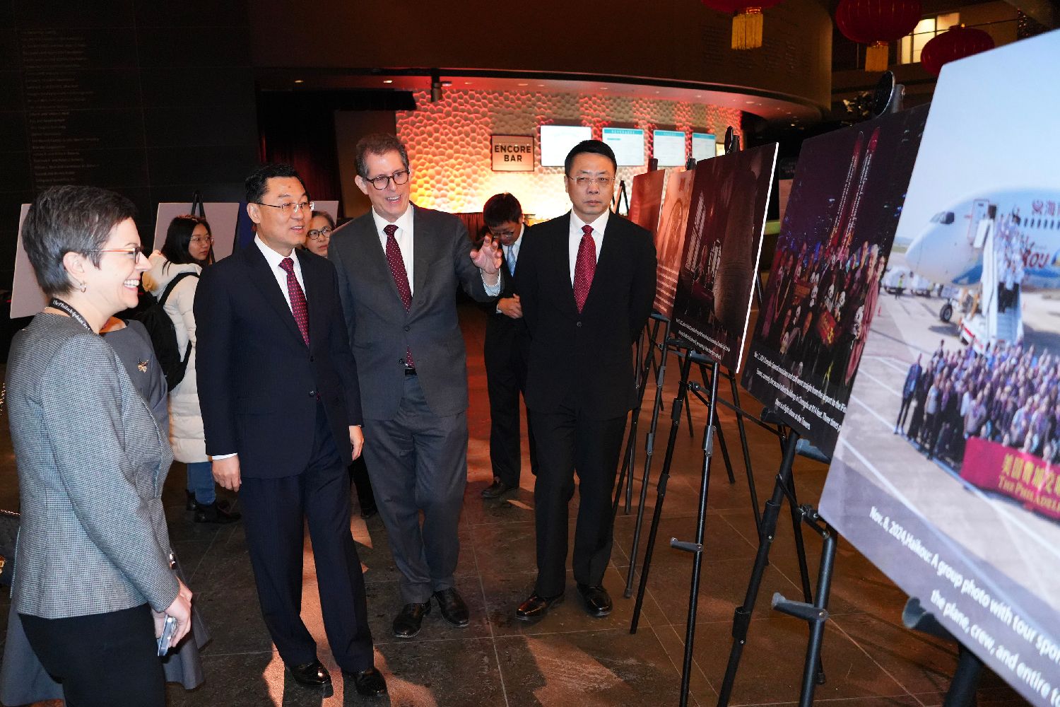中国驻美国大使谢锋(右三)、费城交响乐团总裁兼首席执行官睿恩德(右二)、中国驻纽约旅游办事处主任马云飞(右一)参观“OntheRoadinChina——中国与费城交响乐团”主题展览。