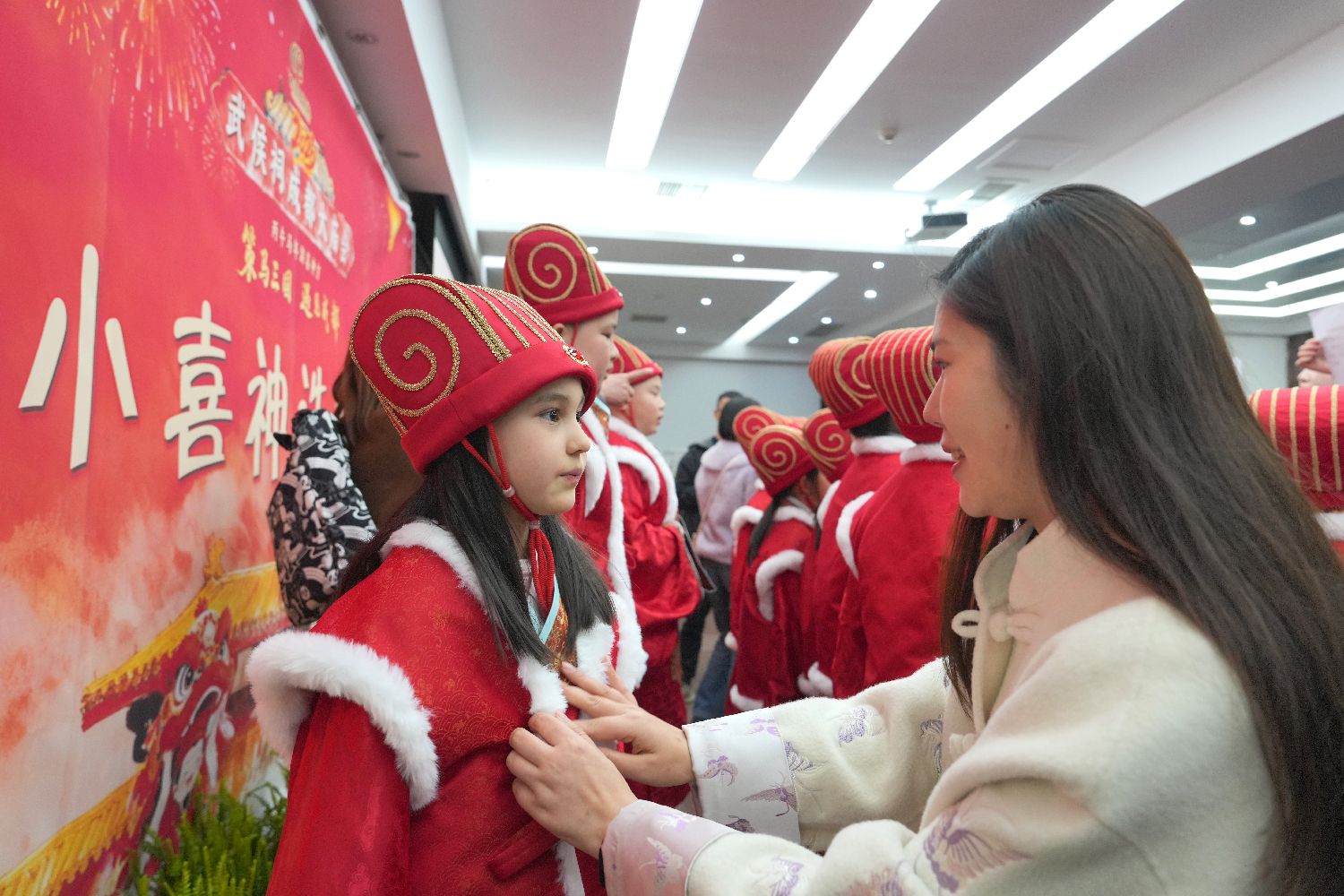 小朋友们身穿中国喜庆传统服装,组成新春送福使者团。图为选出的“小喜神”。