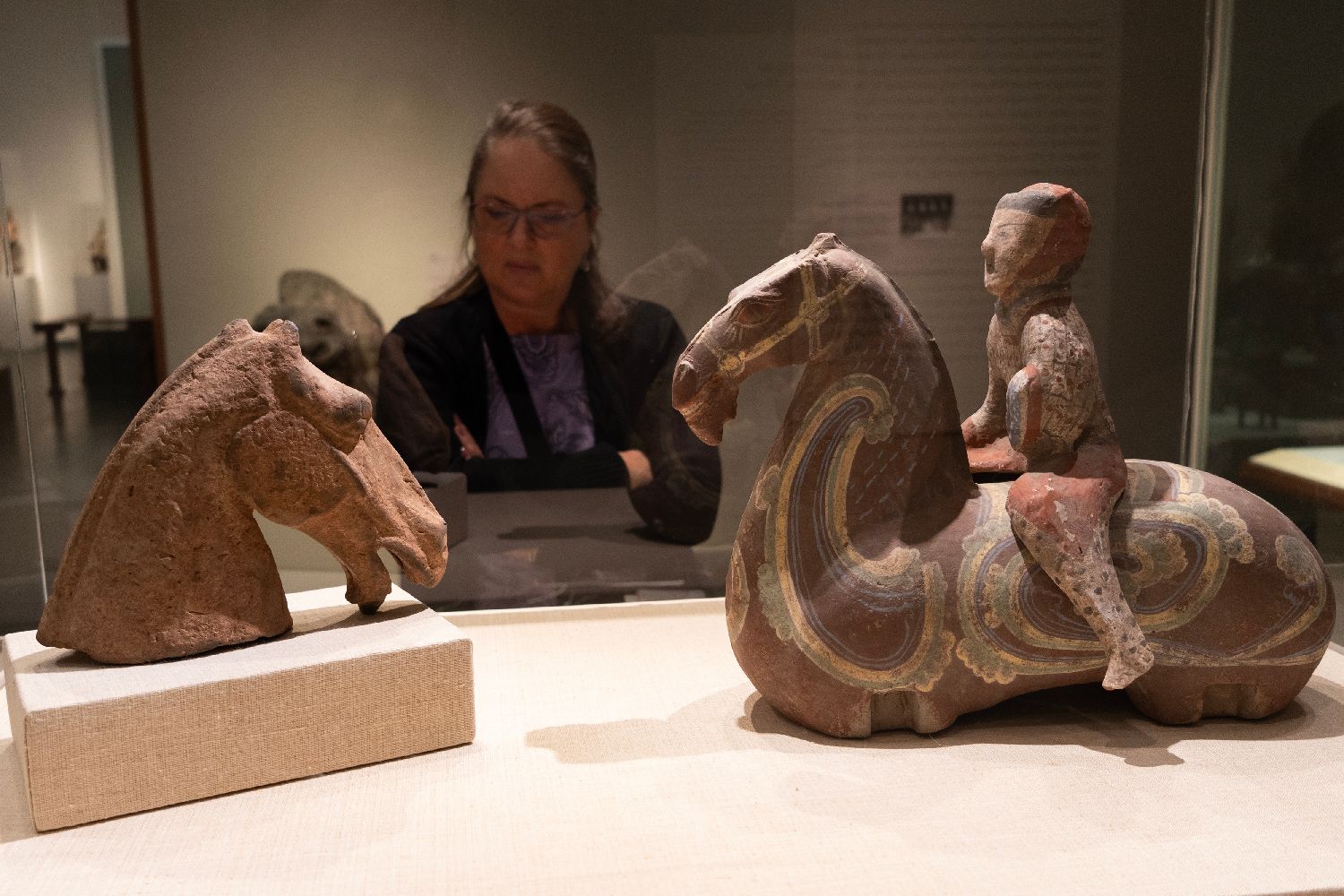 26日,美国纽约大都会博物馆,观众参观“汉彩绘陶骑兵俑”、“汉陶马头”。