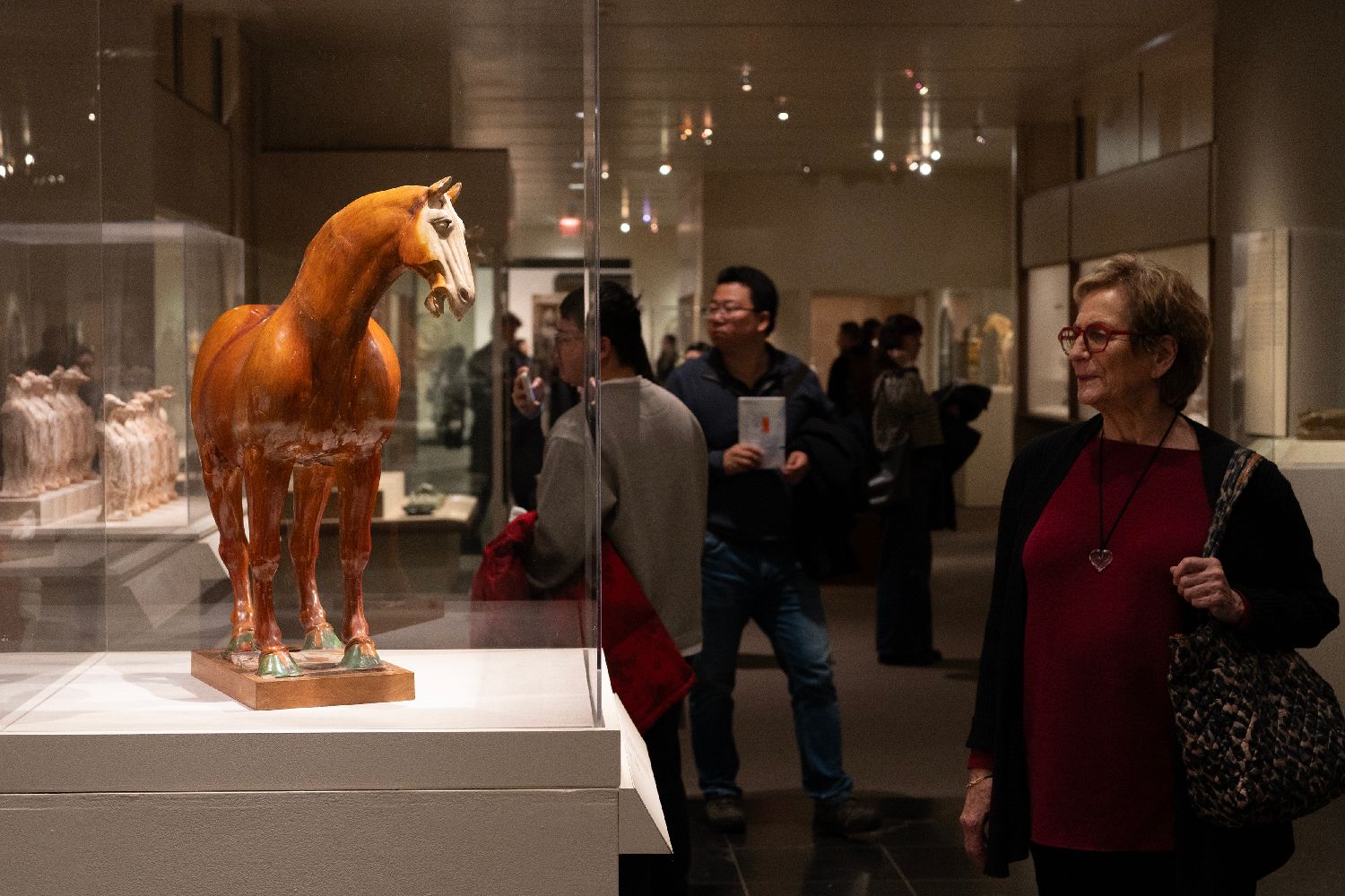 为庆祝马年,大都会艺术博物馆推出《喜迎马年》特展,展览汇集陶瓷、玻璃、玉器、金属制品和木版画等馆藏文物。展期从2026年2月持续到2027年1月。图为观众参观“唐褐釉陶马”。