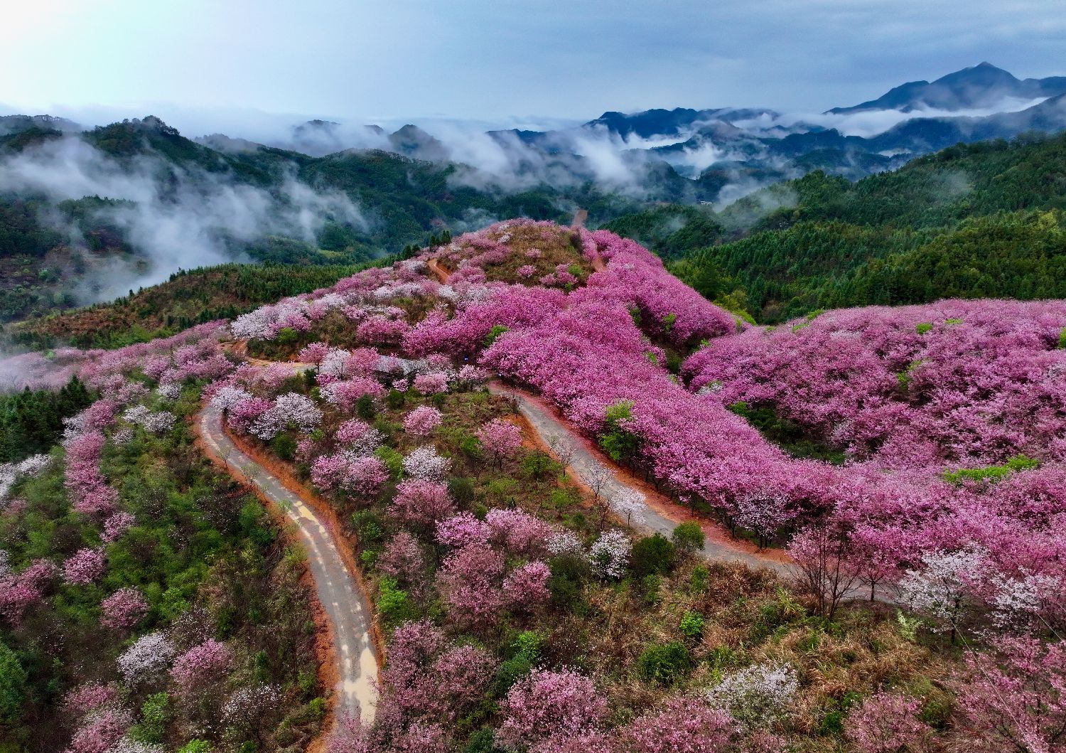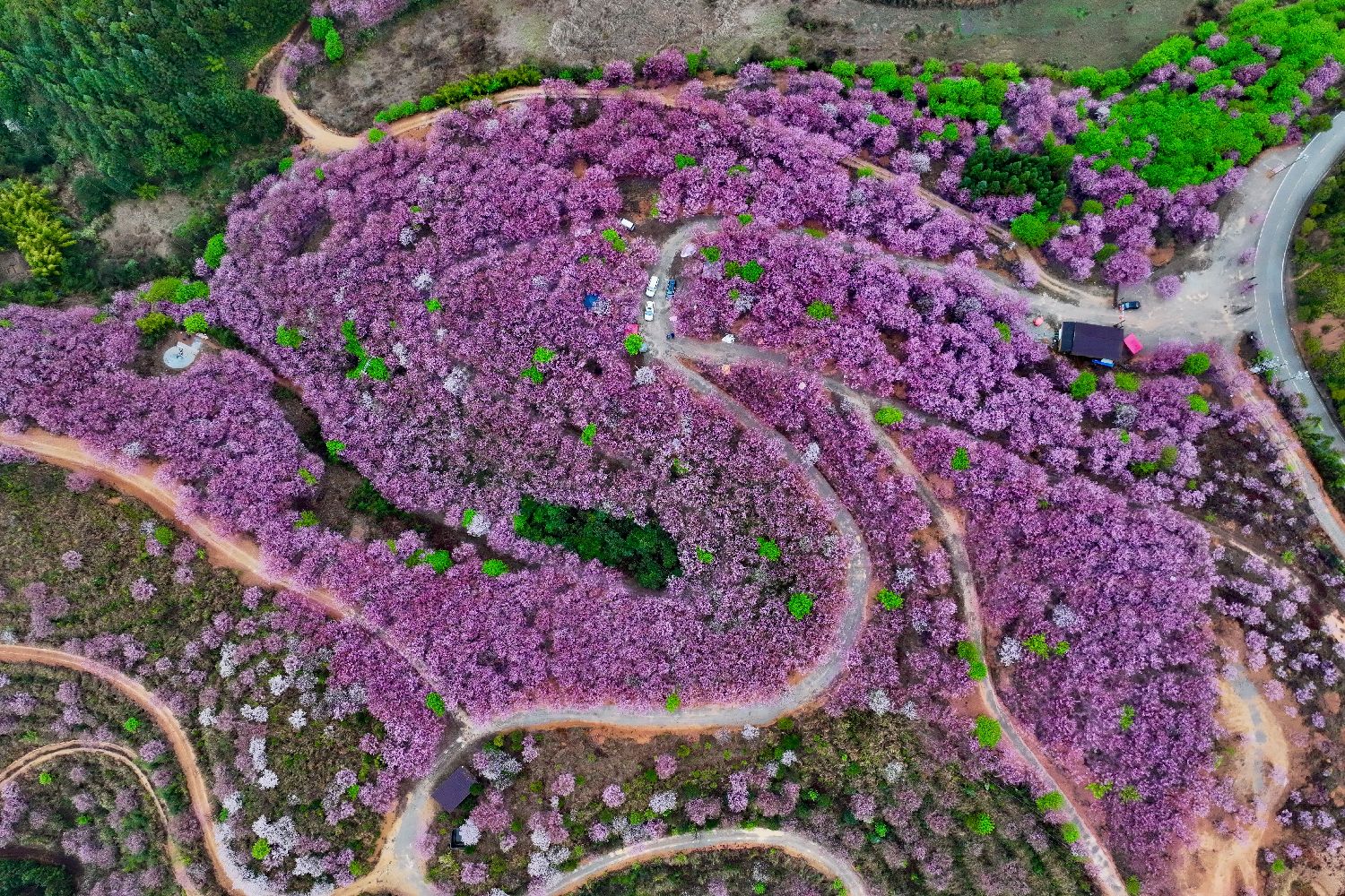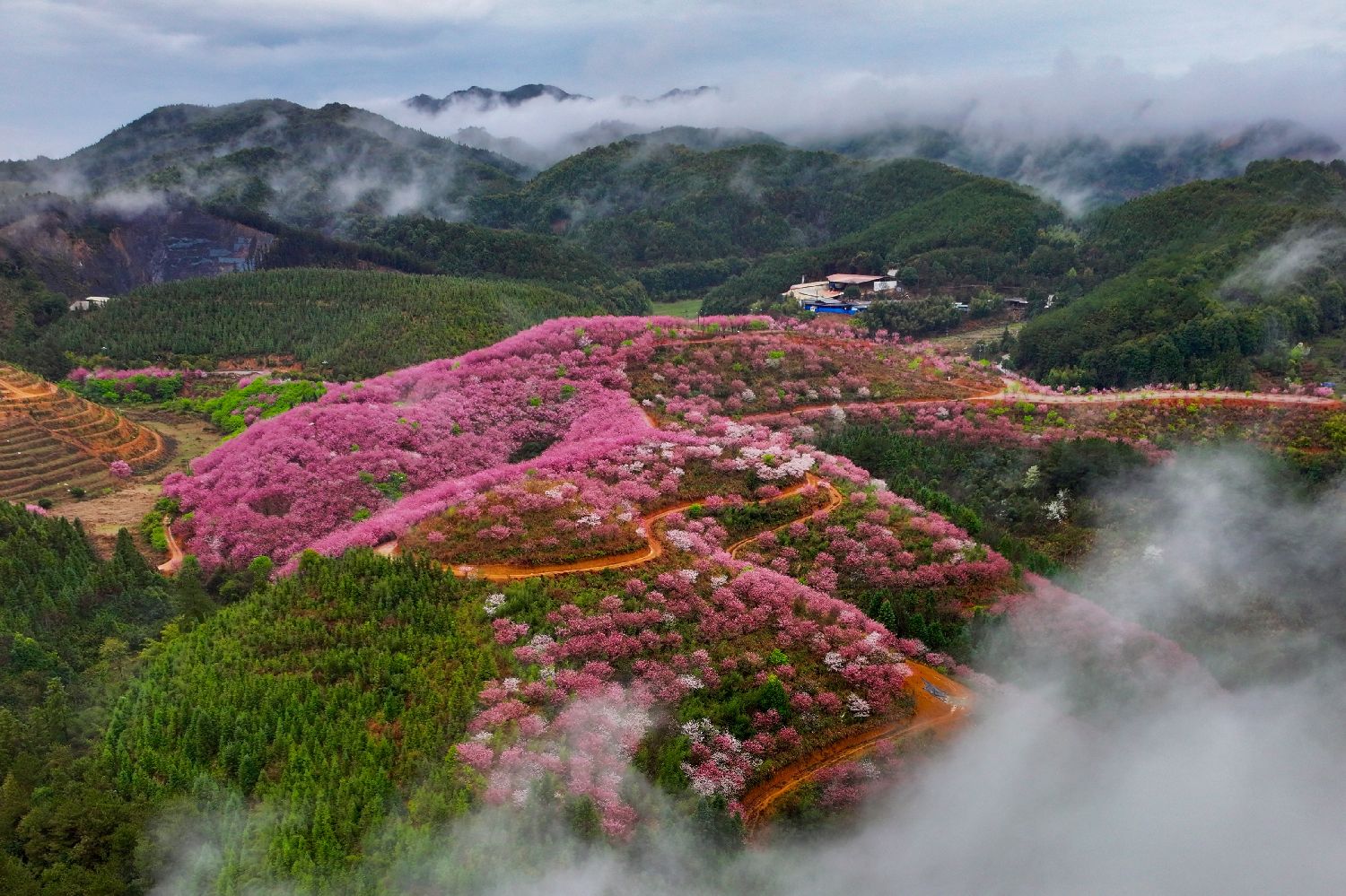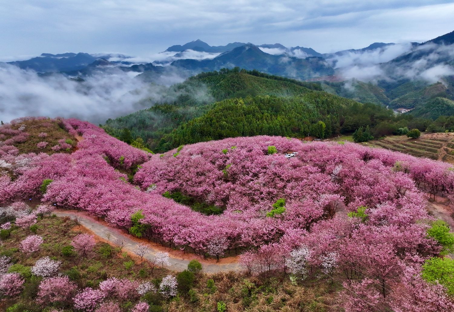 2月28日,福建省大田县武陵乡樱花竞相绽放。(无人机照片)
