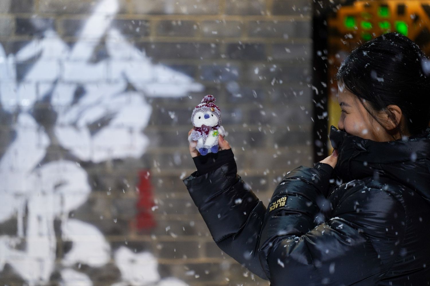 黑龙江哈尔滨,一名游客10日拿着玩偶在飘雪小院打卡。