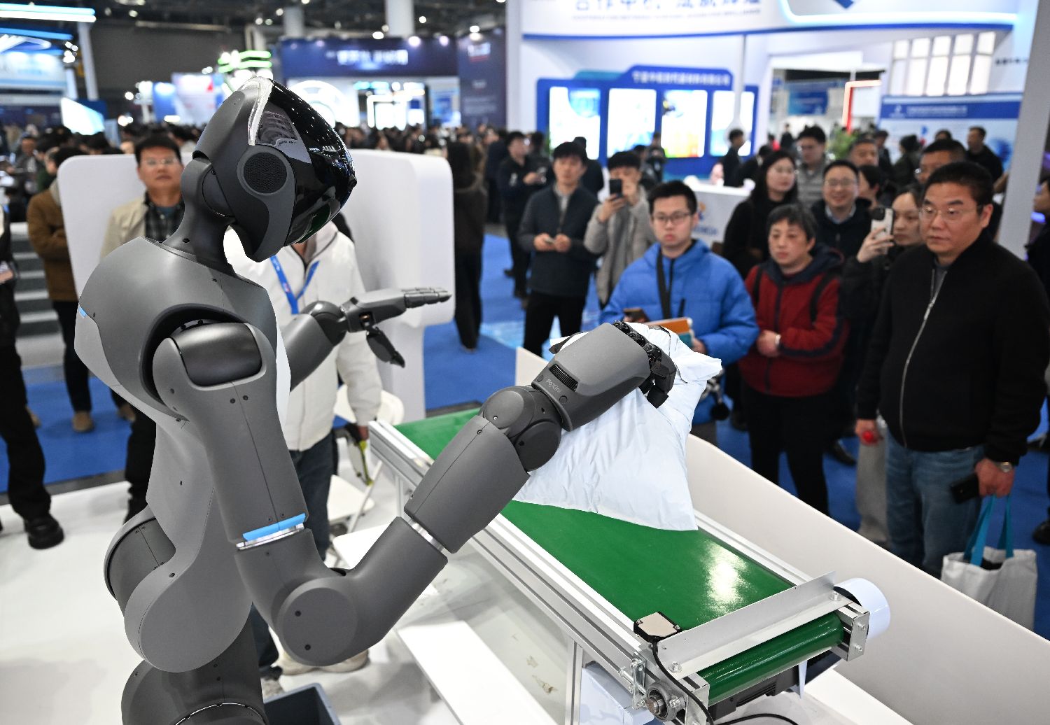 3月11日,第三届中国具身智能机器人产业大会暨展览会在浙江杭州举行,各种类型的人形机器人及零部件集中展示。