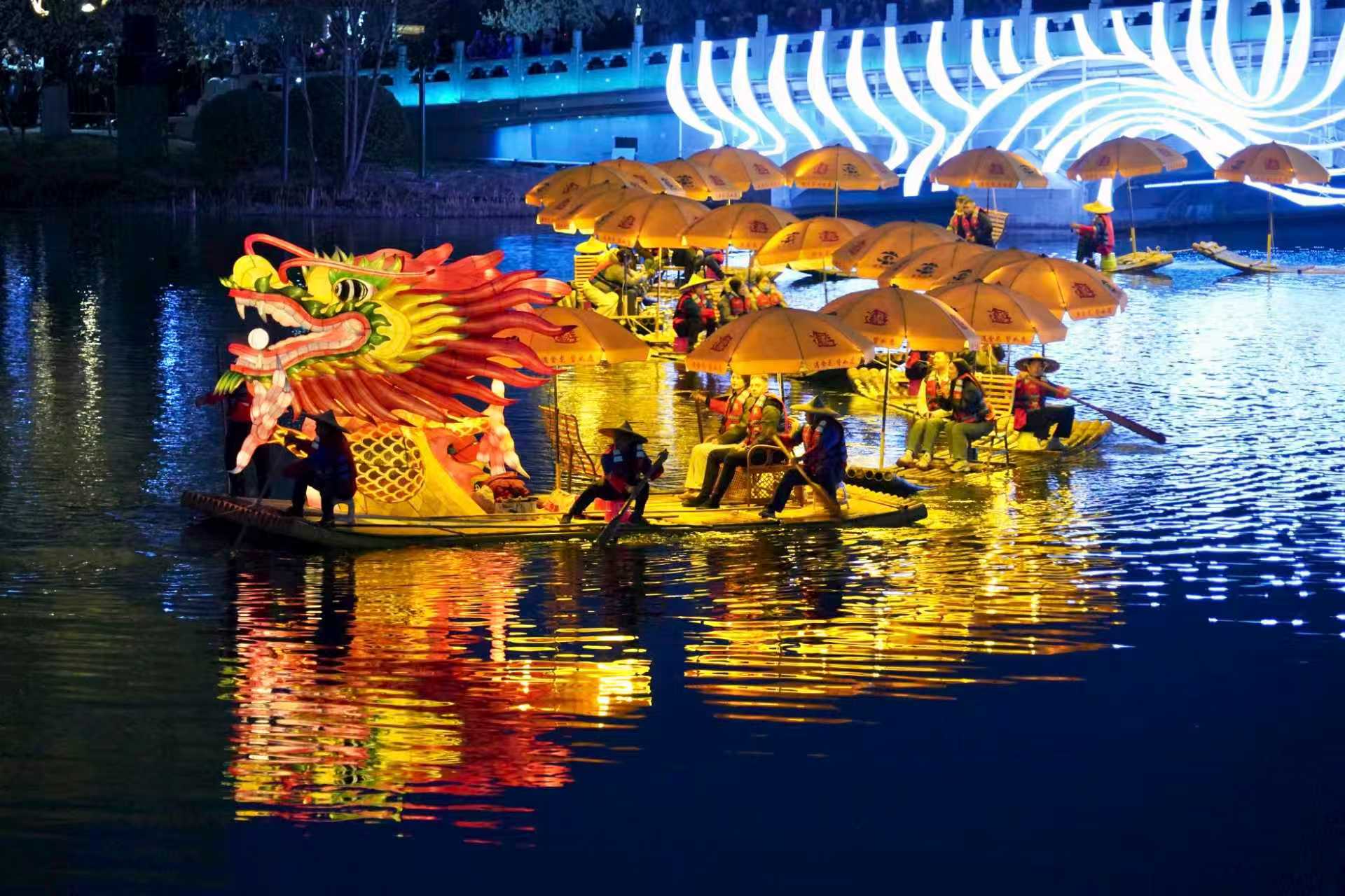 流光龙影与河畔灯火交相辉映。