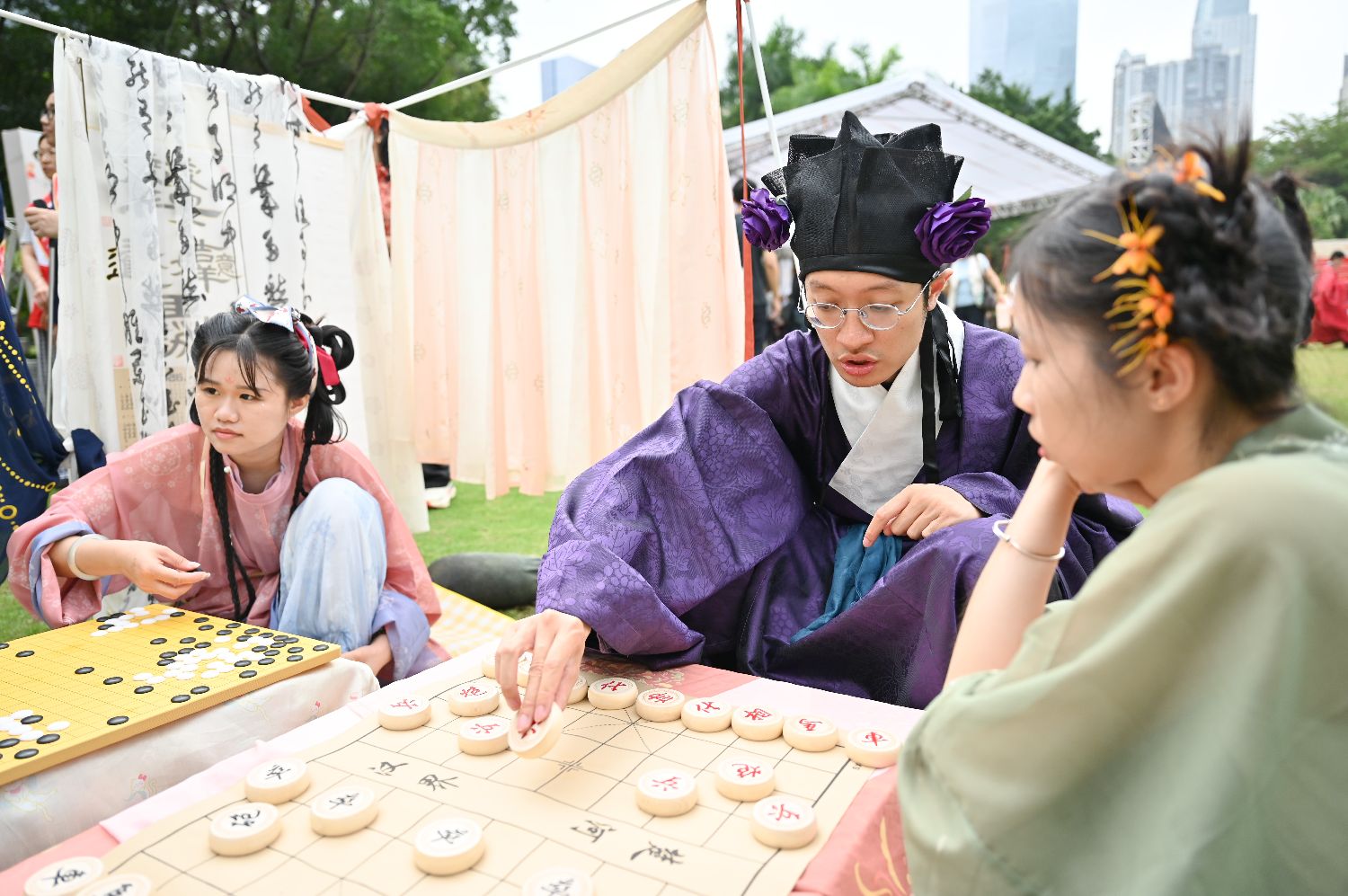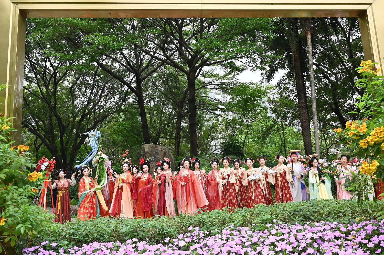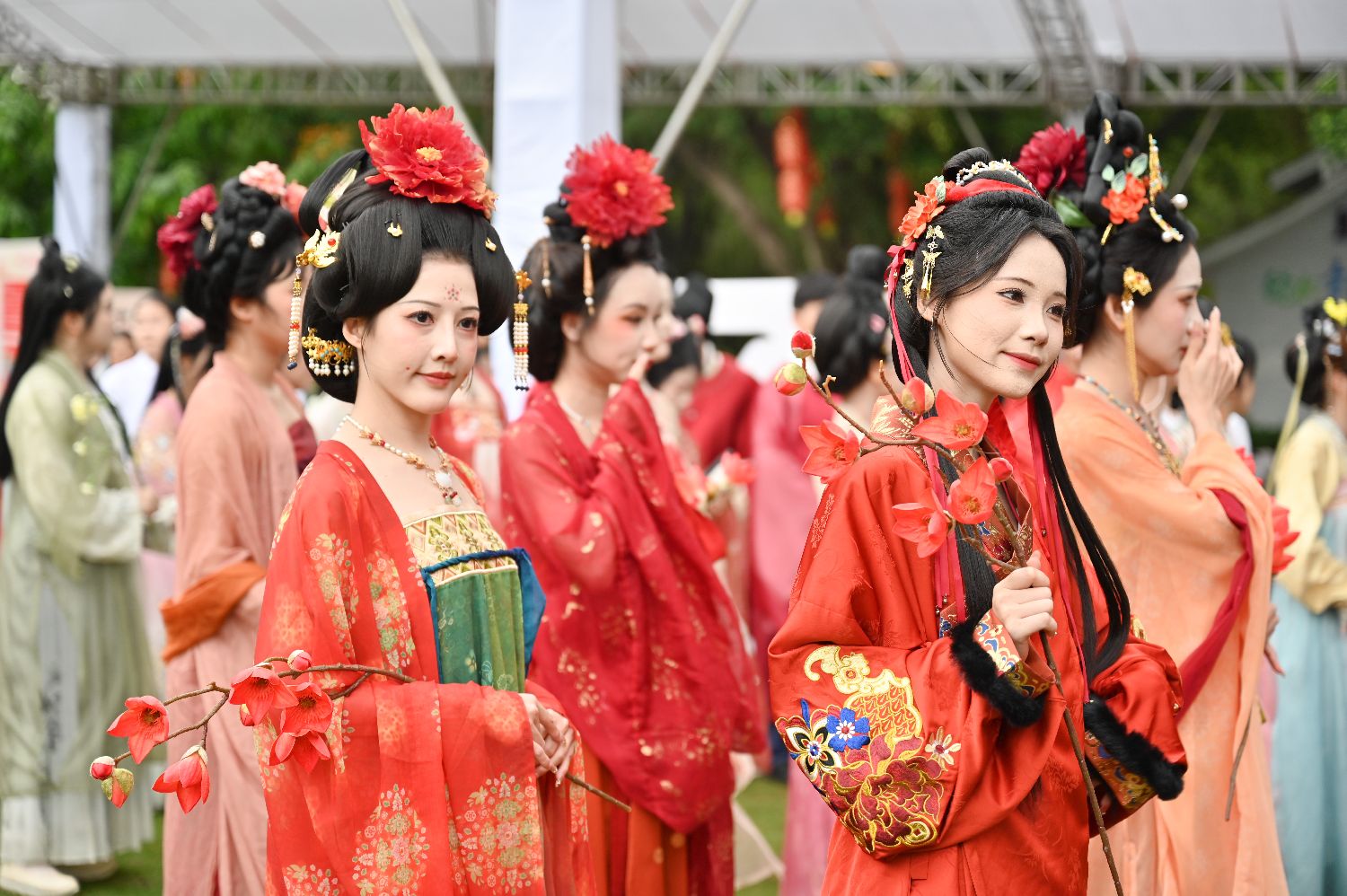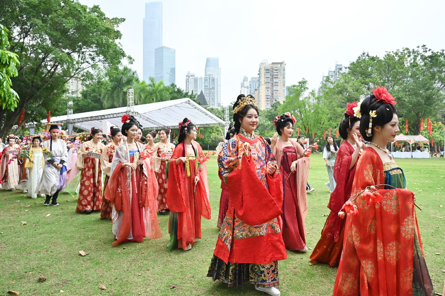 图为穿着汉服的工作人员手持花枝在珠江公园巡游。