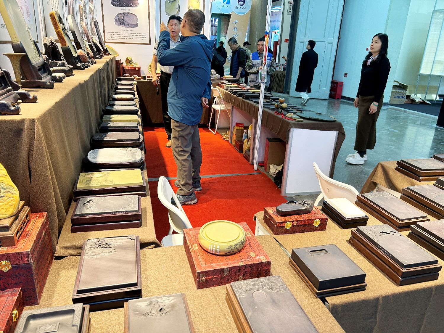 博览会展台上,各式雕刻精美的砚台错落陈列,花纹细腻,造型各异。(楠贝摄)