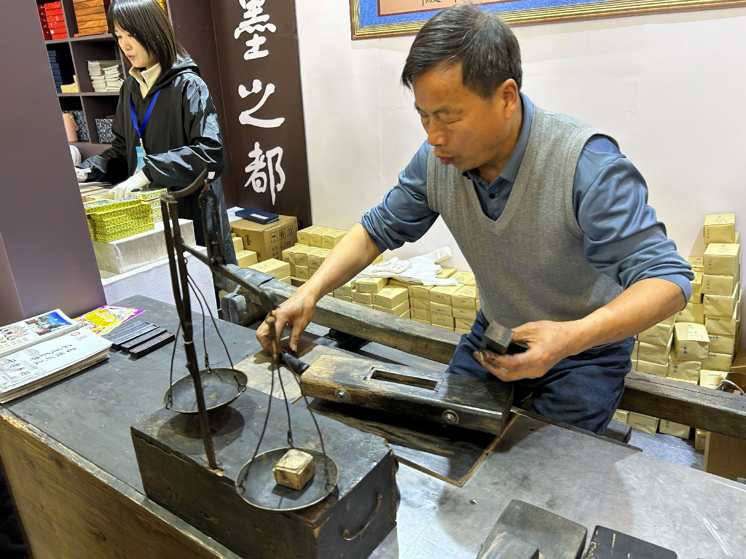 来自“徽墨之都”的制墨手艺人手持小天平仔细称量墨料。(楠贝摄)