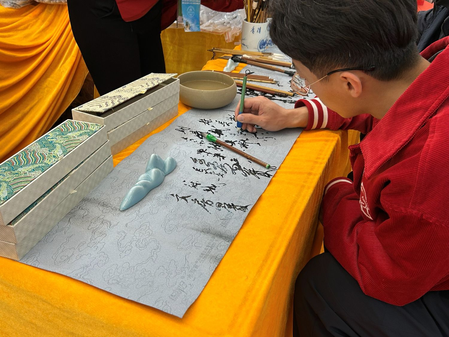 博览会观众手持毛笔,俯身认真试笔。(楠贝摄)