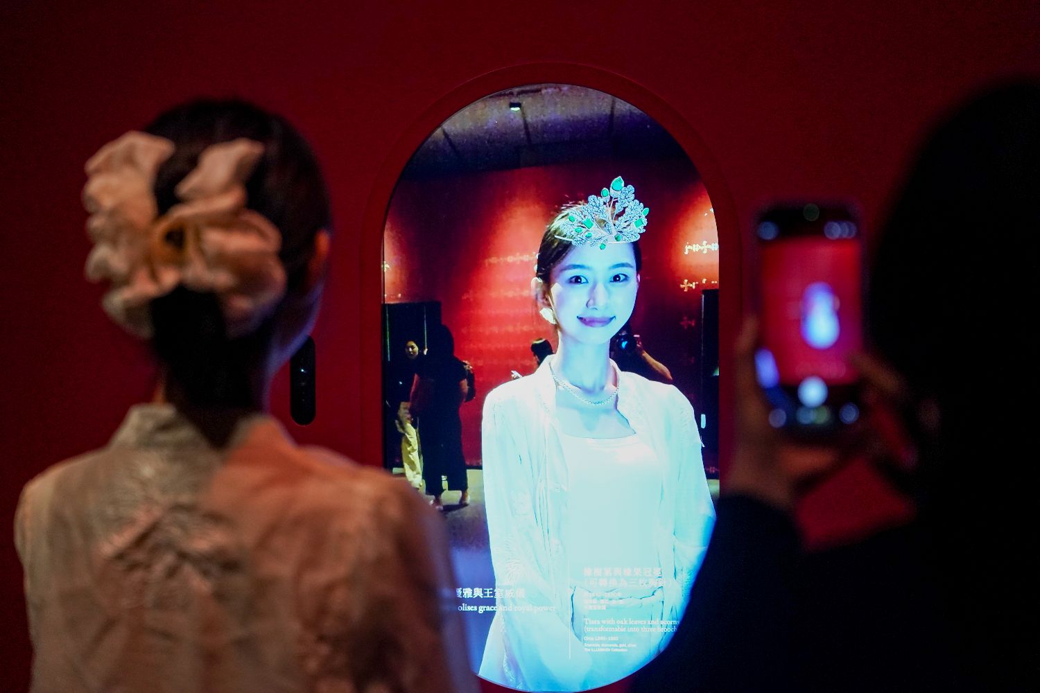 图为一名女士通过数字技术“佩戴”珠宝头饰。