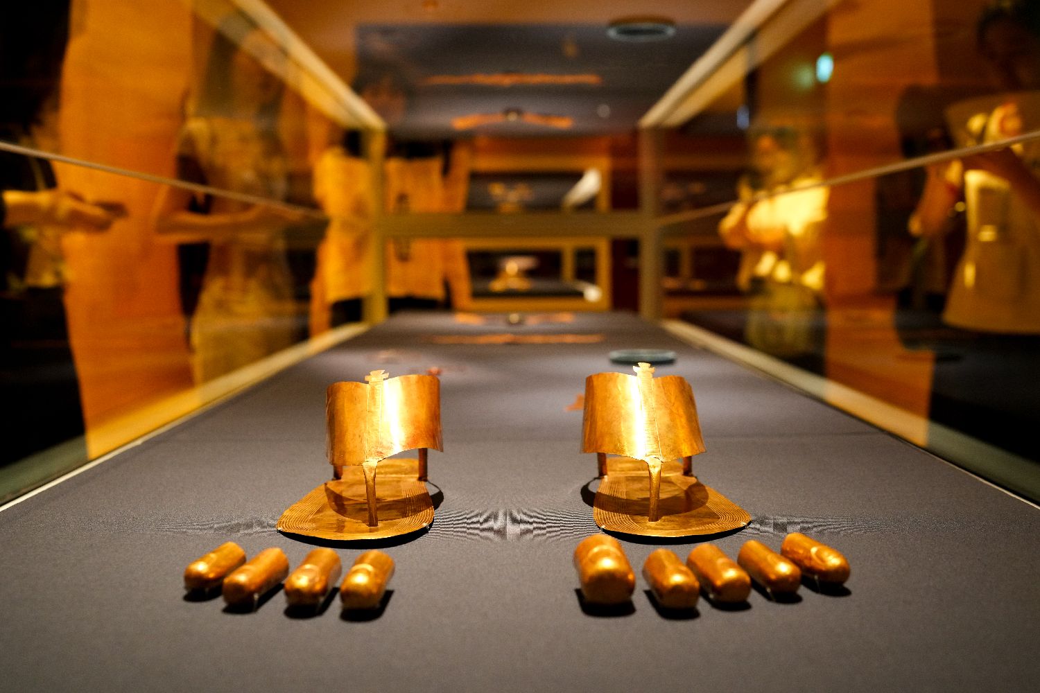 图为展出的埃及新王国时期的拖鞋和脚趾套。