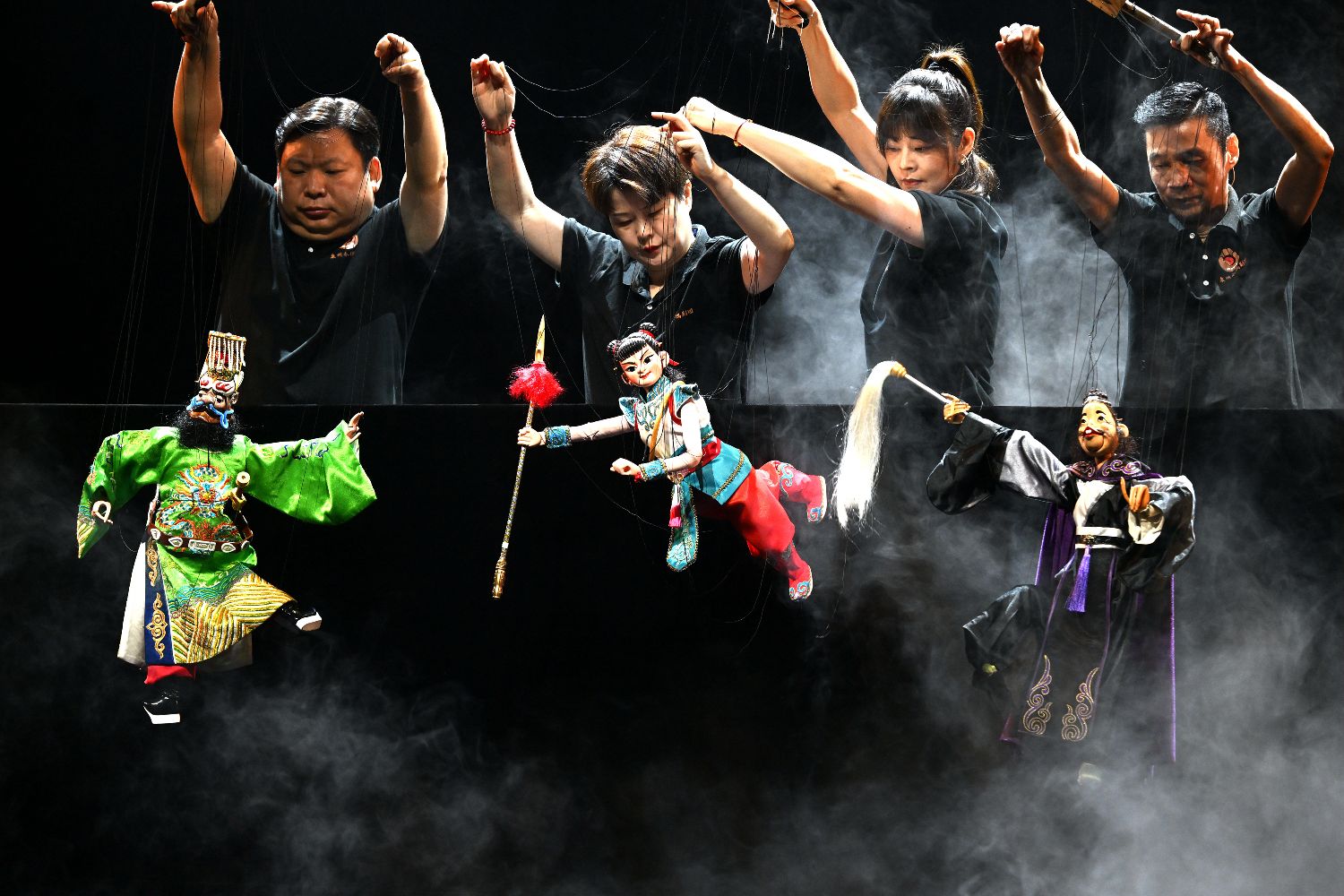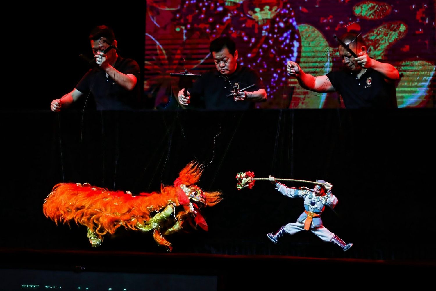 5月3日举行的泉州提线木偶戏专场演出,演员联手操纵丝线演绎传统剧目《狮子舞》。(图片来源:中新社)