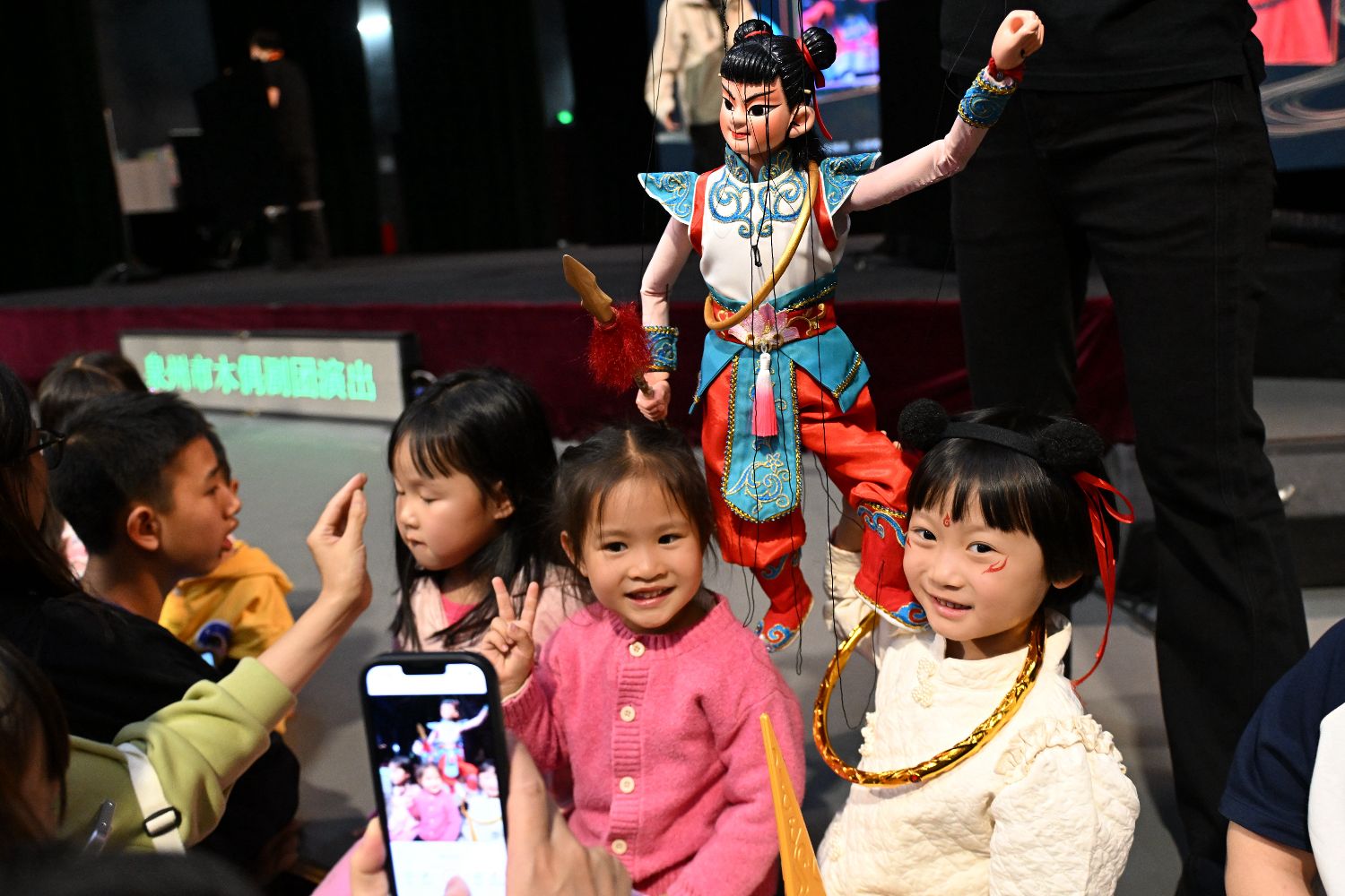 图为新编提线木偶戏《哪吒·绝地反击》首演结束后,小观众与“哪吒”合影。(图片来源:中新社)