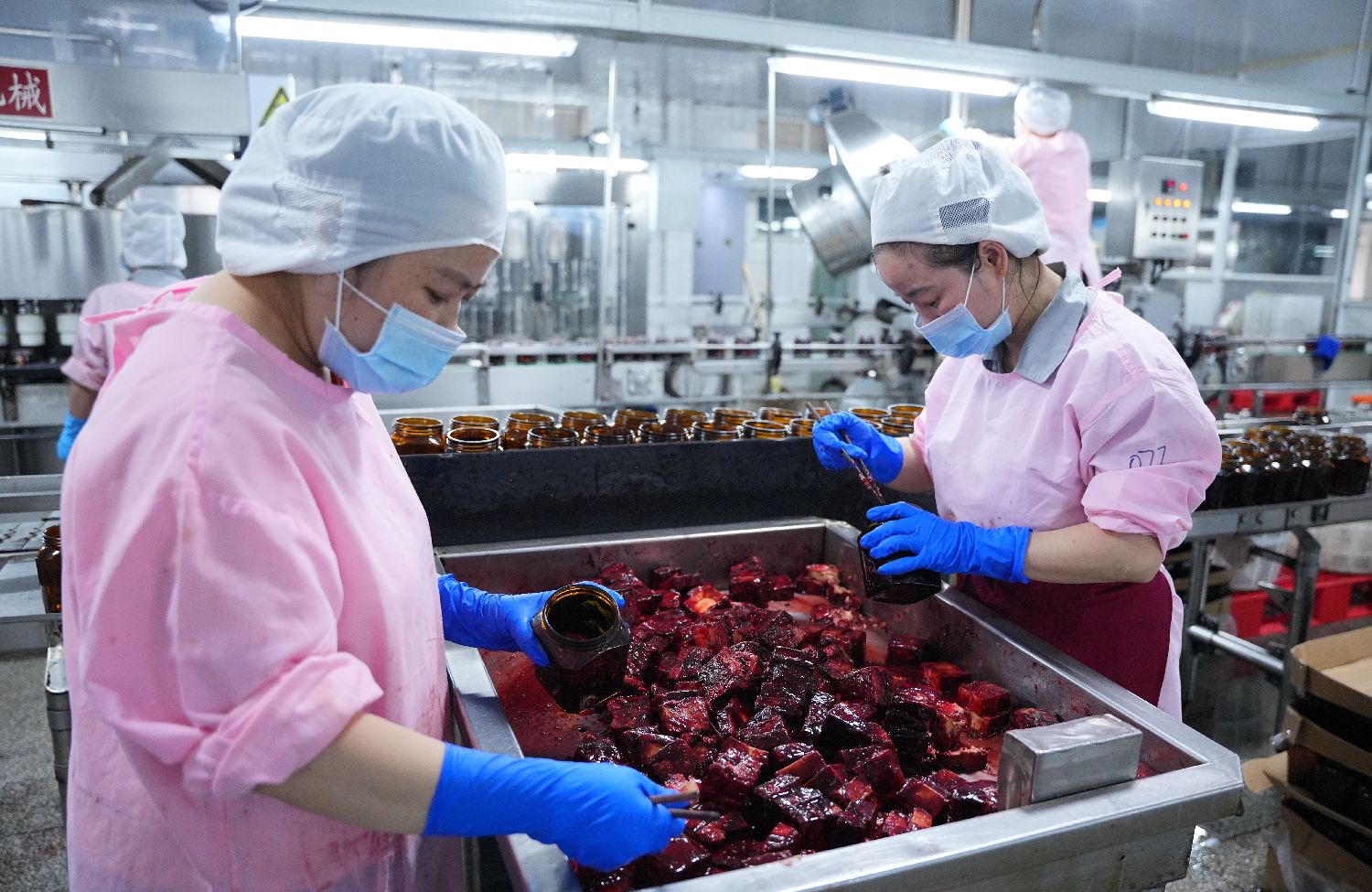 6月13日,在浙江绍兴一腐乳生产车间,工人们对腐乳进行装瓶。(图片来源:中新社)