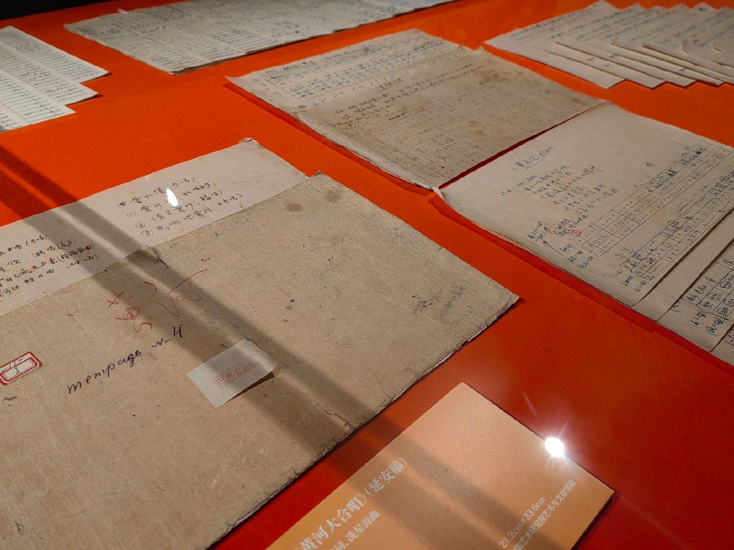 “战歌震山河”展区最重磅展品是馆藏的两部冼星海《黄河大合唱》手稿,一部是1939年延安的简谱手稿,另一部是1941年莫斯科的五线谱总谱手稿。2003年,这两部手稿同时入选第二批《中国档案文献遗产名录》。现场还展出了冼星海的多件创作手稿和日记,冼星海使用过的钢笔、小提琴、钢琴等珍贵遗物。