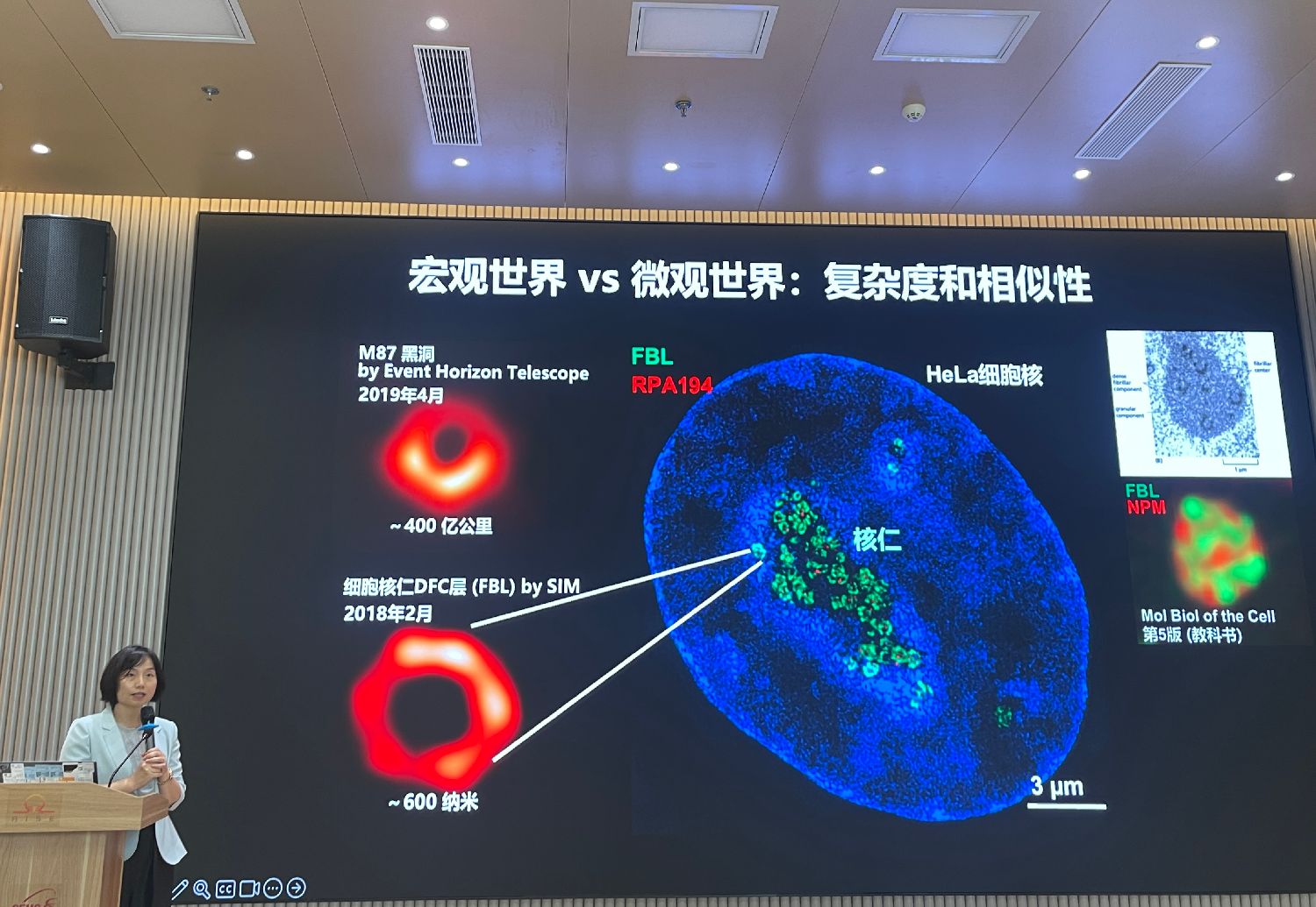 她在现场展示了一组照片,一张是事件视界望远镜(EHT)于2019年4月发布的人类首张黑洞照片——M87黑洞,该黑洞事件视界直径约为400亿公里;另一张是2018年2月,陈玲玲团队拍摄到的细胞核仁DFC(致密纤维组分)层图像,其直径约为600纳米。