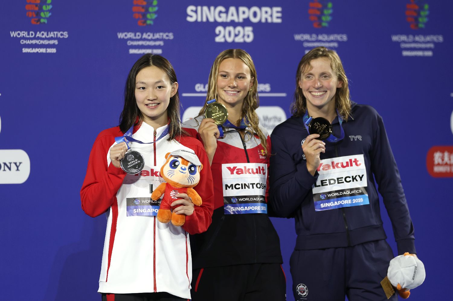 7月27日,在新加坡举行的2025年世界游泳锦标赛女子400米自由泳决赛中,中国选手李冰洁以3分58秒21刷新自己保持的亚洲纪录,获得银牌。这是本届世锦赛中国游泳队收获的首枚奖牌。图为获得金牌的加拿大选手麦金托什(中)、获得银牌的中国选手李冰洁(左)、获得铜牌的美国选手莱德茨基合影。(图片来源:中新社)