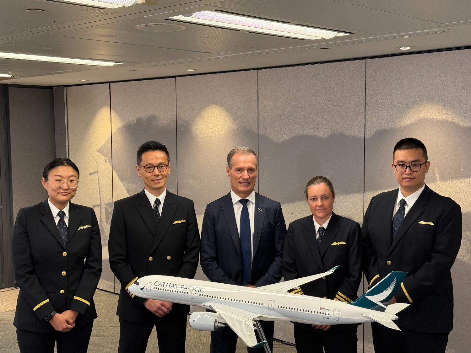 7月28日,国泰航空首批中国内地机师在香港国泰城接受媒体采访。图为内地机师代表、二副机长廉荦(左一),国泰航空飞行训练经理、资深培训机长冯应聪(左二),国泰航务董事甘沛思(中),国泰航空首席机长、资深培训机长Kirsty Smith(音译“柯斯蒂·史密斯”,右二),内地机师代表、二副机长孙钰明(右一)。(图片来源:中新社)