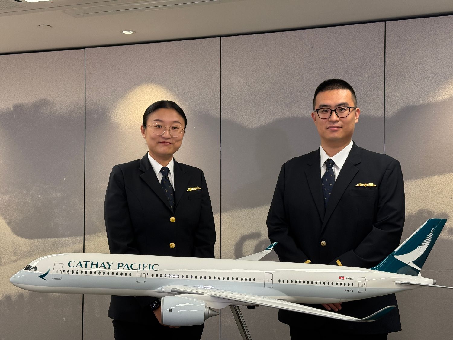 图为国泰航空内地机师代表、二副机长廉荦(左)和孙钰明(右)。(图片来源:中新社)